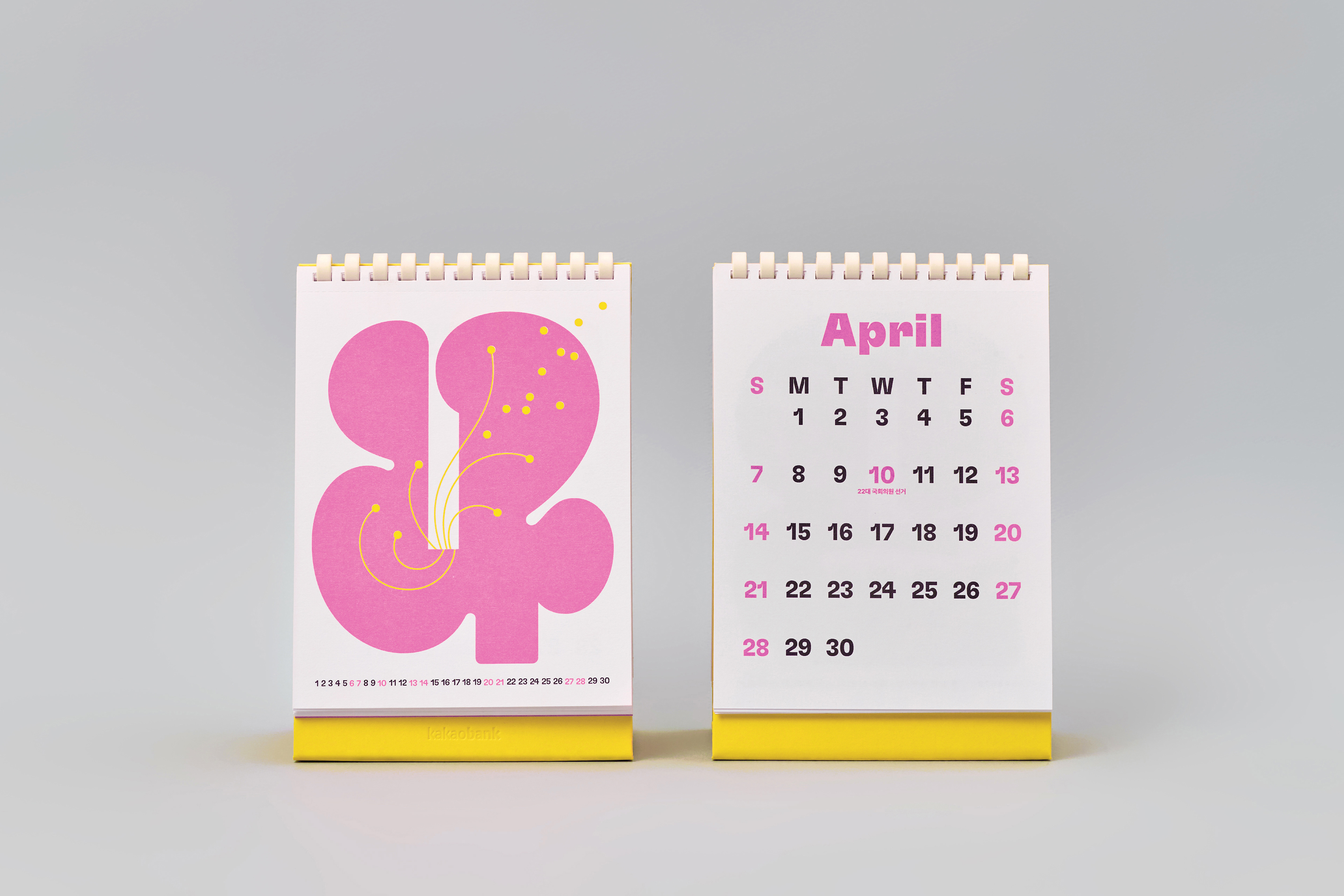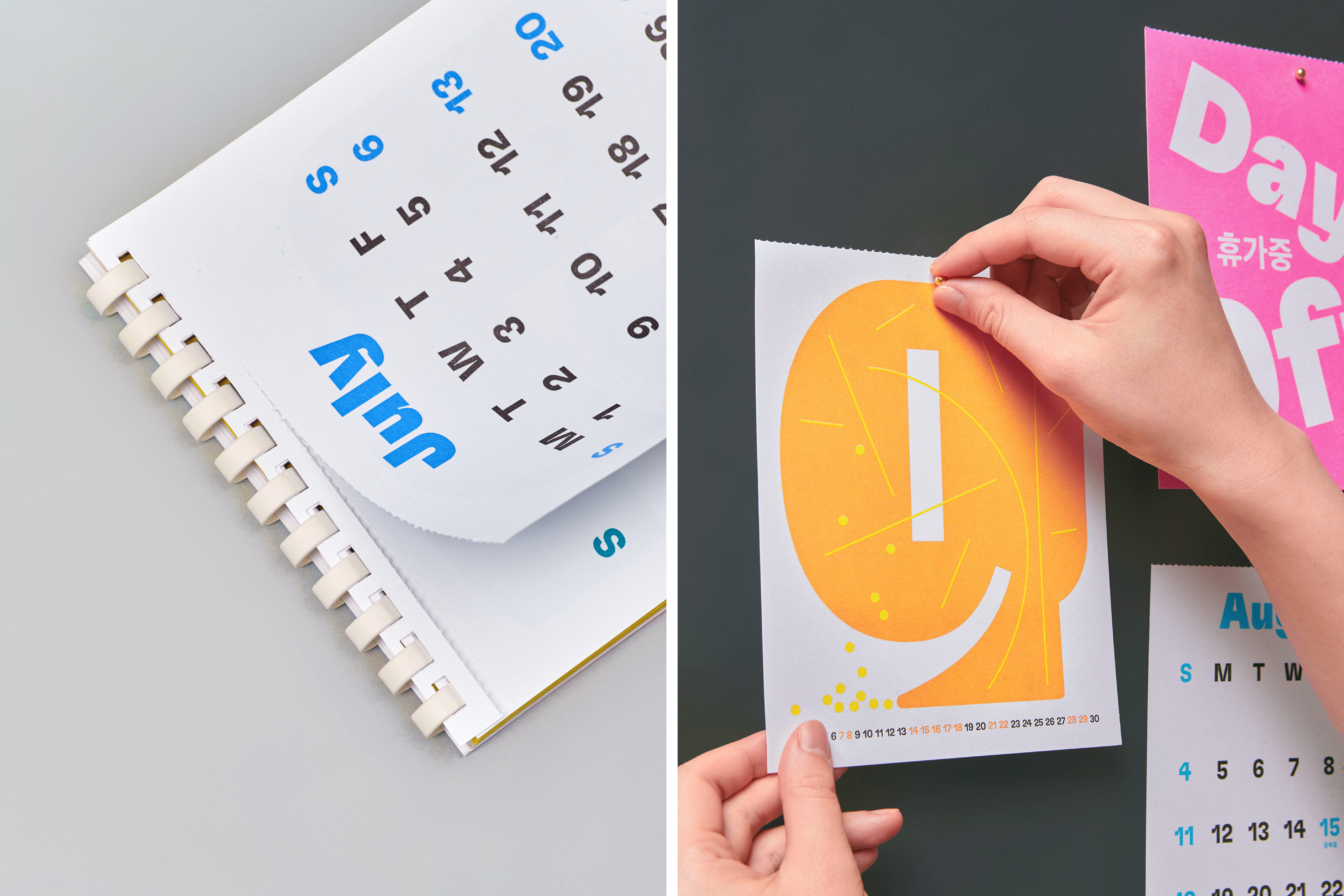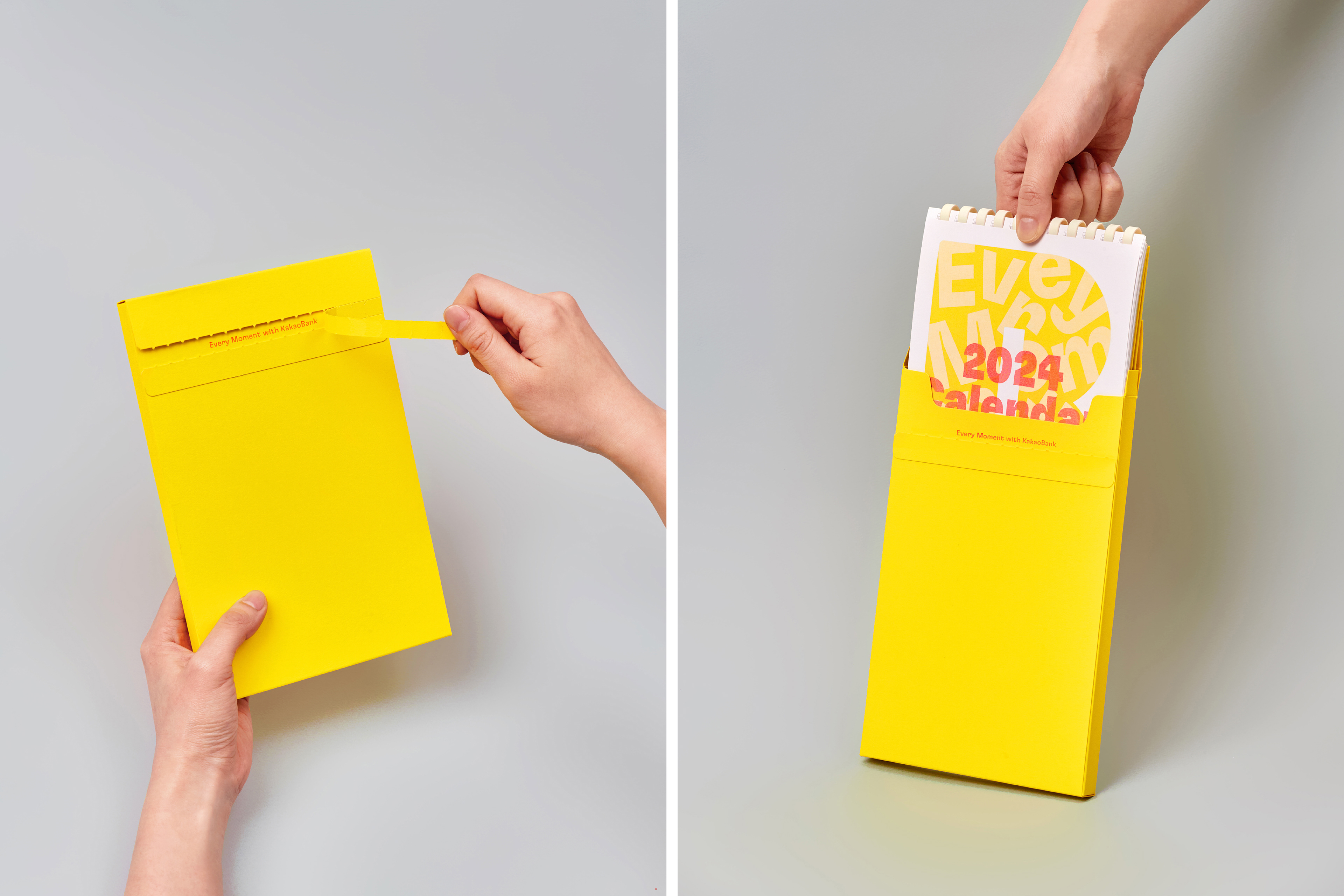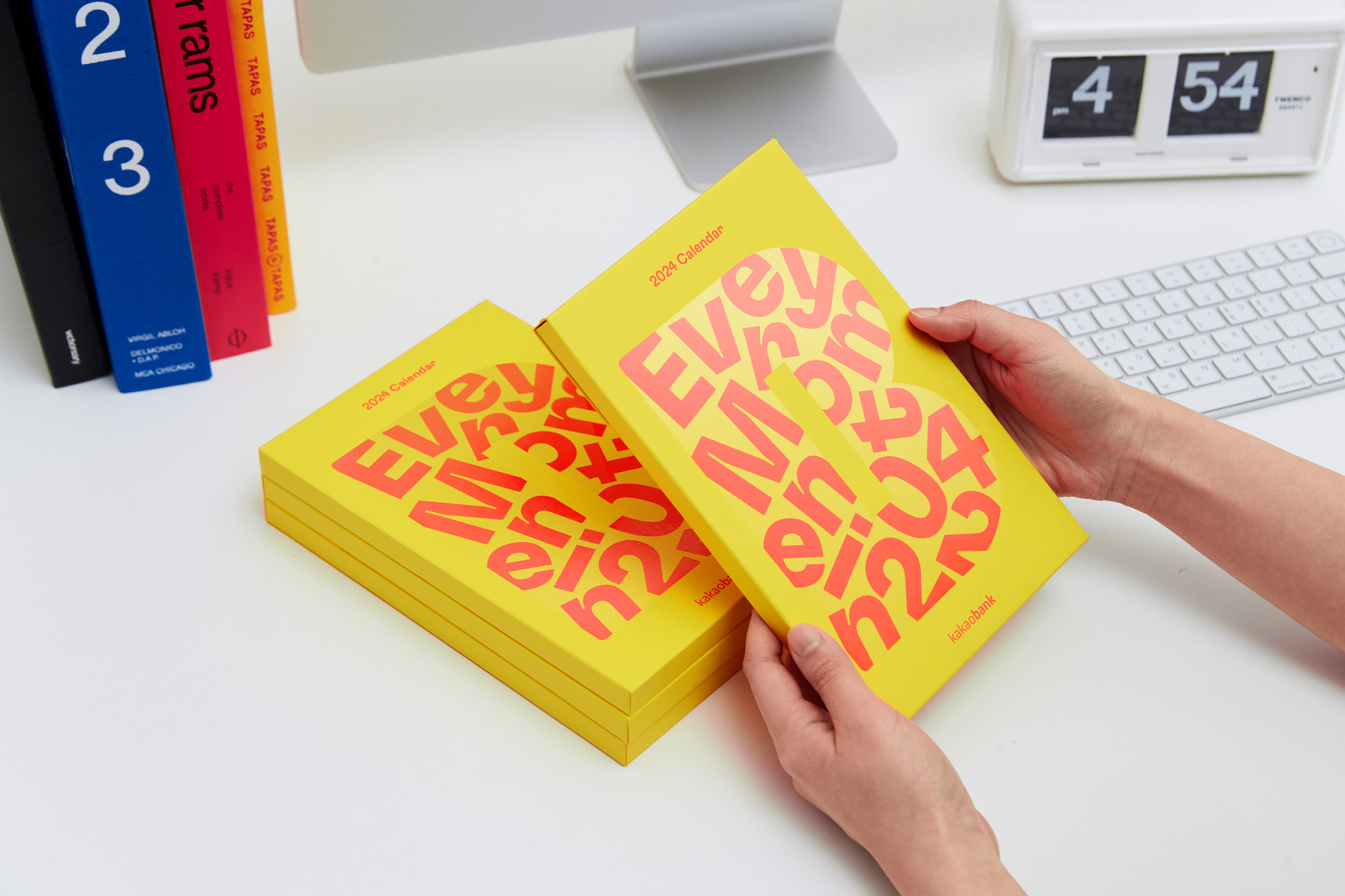 This is a 2024 calendar for Kakaobank crew. Unlike other typical bank calendars, ours is made with vivid colors to give off a special 'end of year' gift-like impression. Symbol B, which originally represented a money box, transforms into numbers embracing various objects in the calendar, showing Kakaobank's identity of sharing everyday moments. Additionally, to convey a fresh energy and vibrant color each month, we utilized the risograph technique for the production of this calendar.
