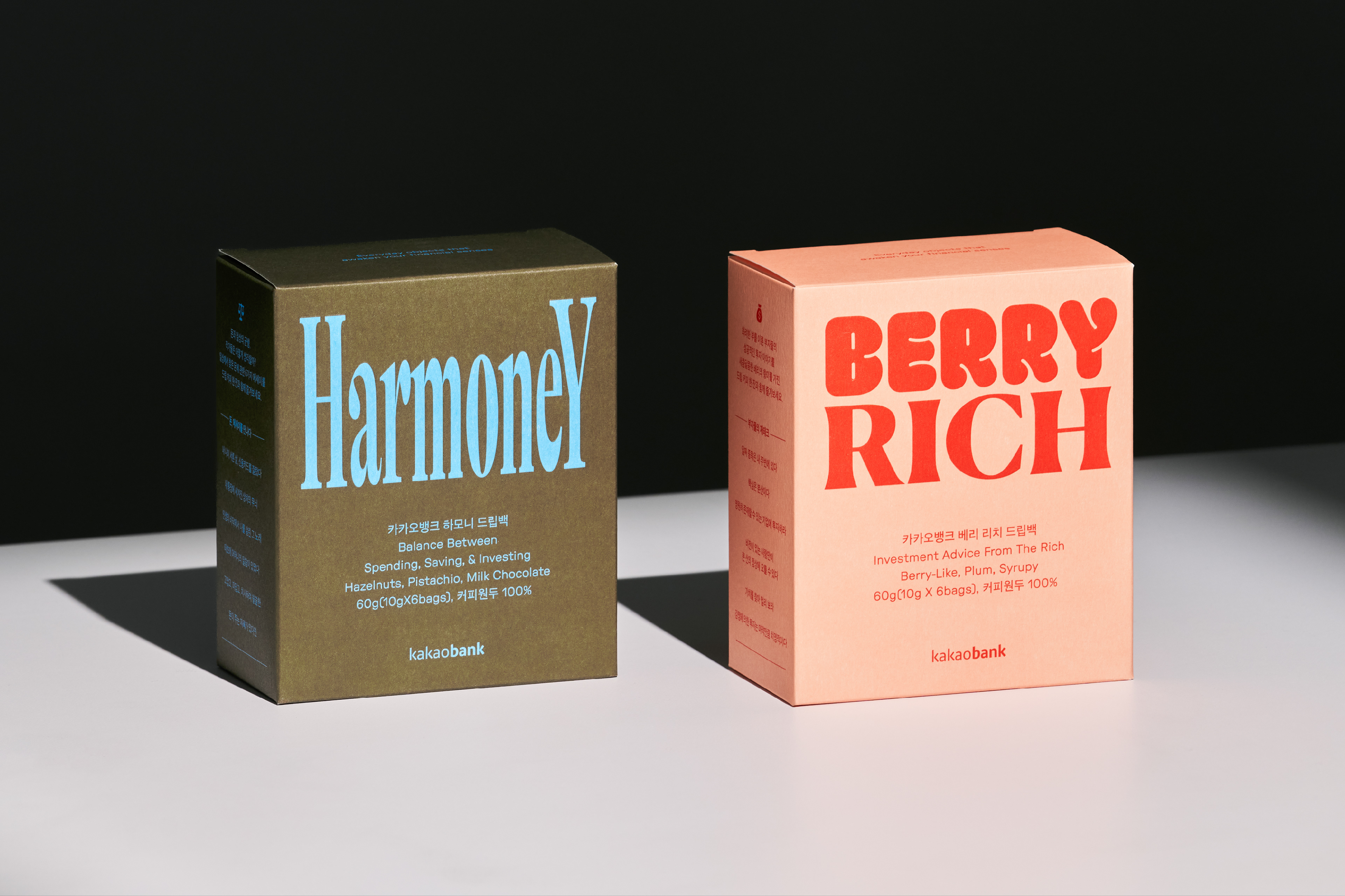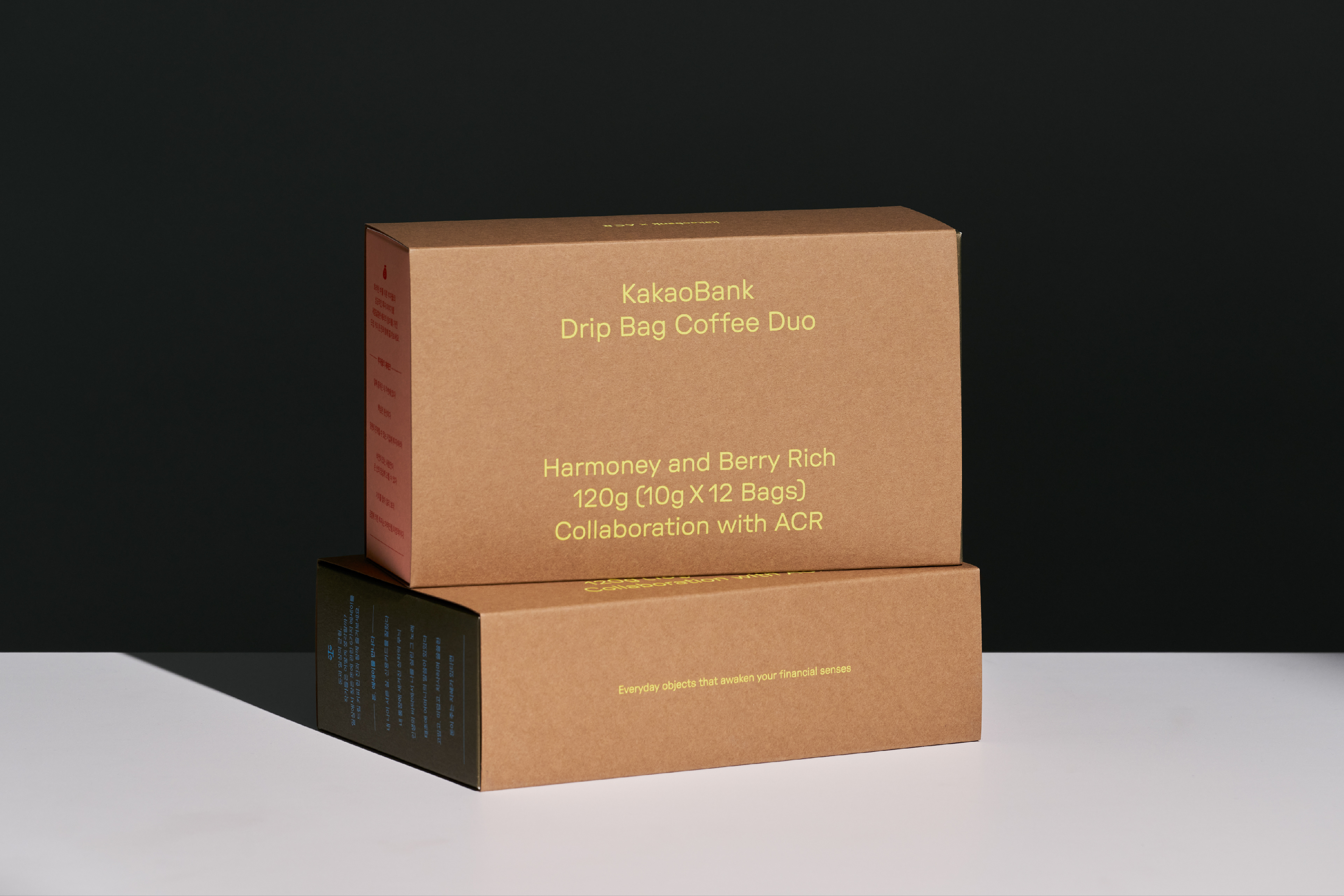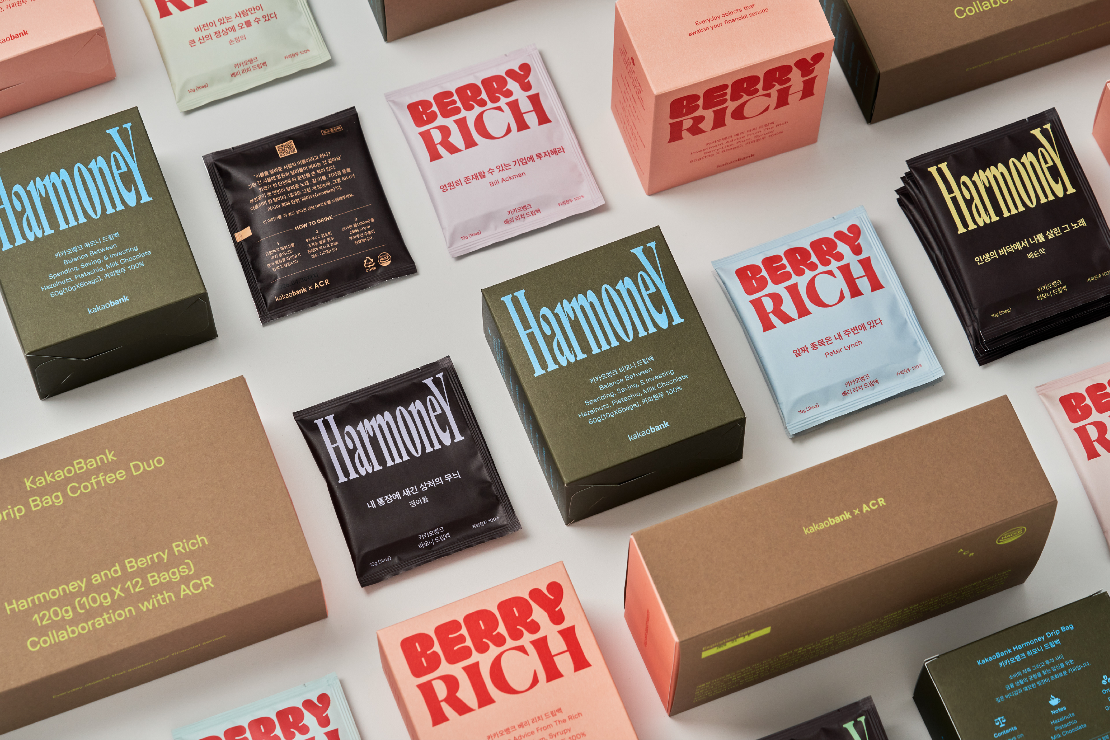 Kakaobank collaborated with ACR, a local roastery renowned for its specialty coffee, to develop its own signature blend. The blend is available in two distinct variations, named Harmoney and BerryRich, which are inspired by financial themes. Additionally, the 12-pack drip bag set is designed with QR codes that provide easy access to finance-related content.