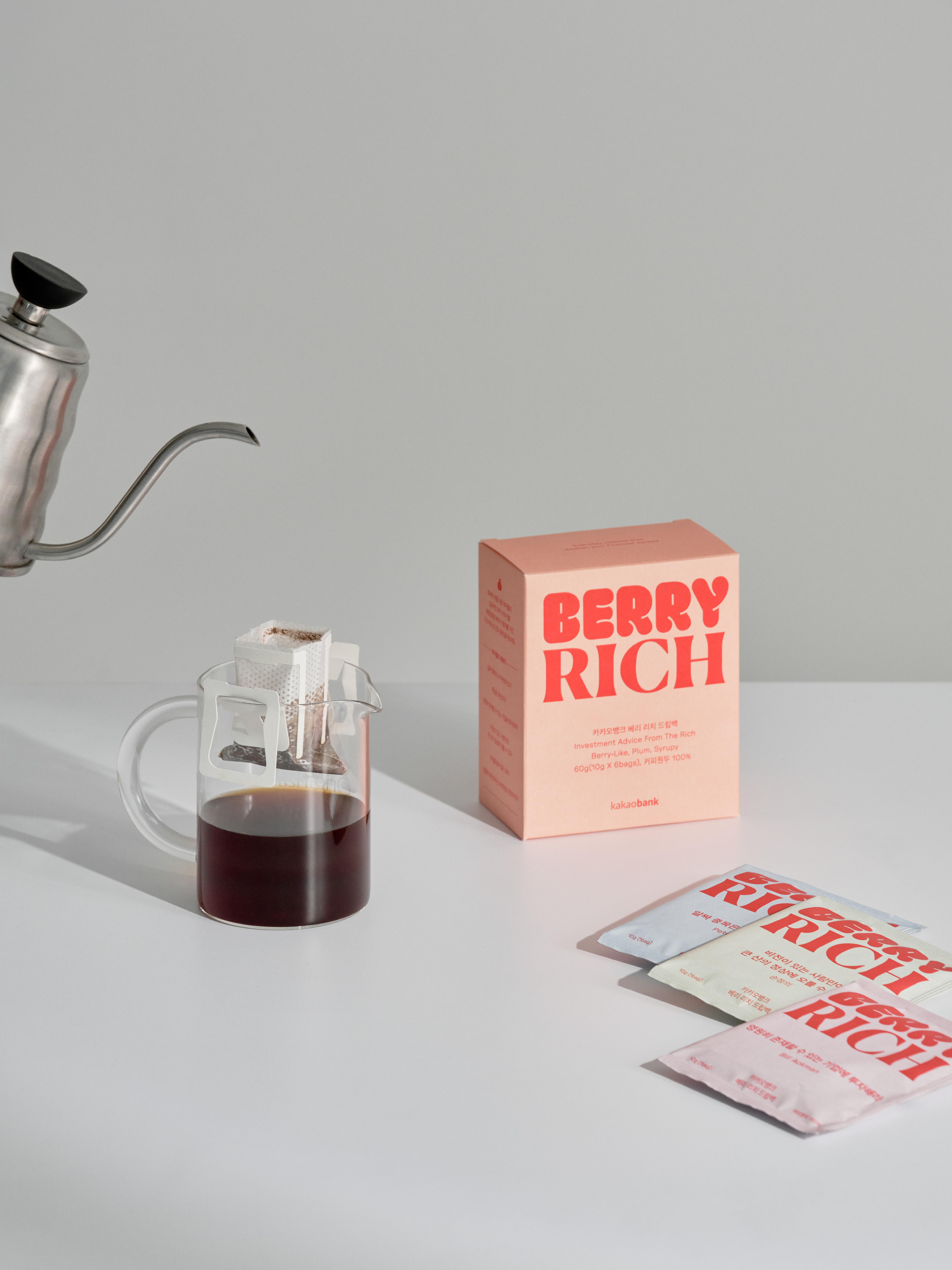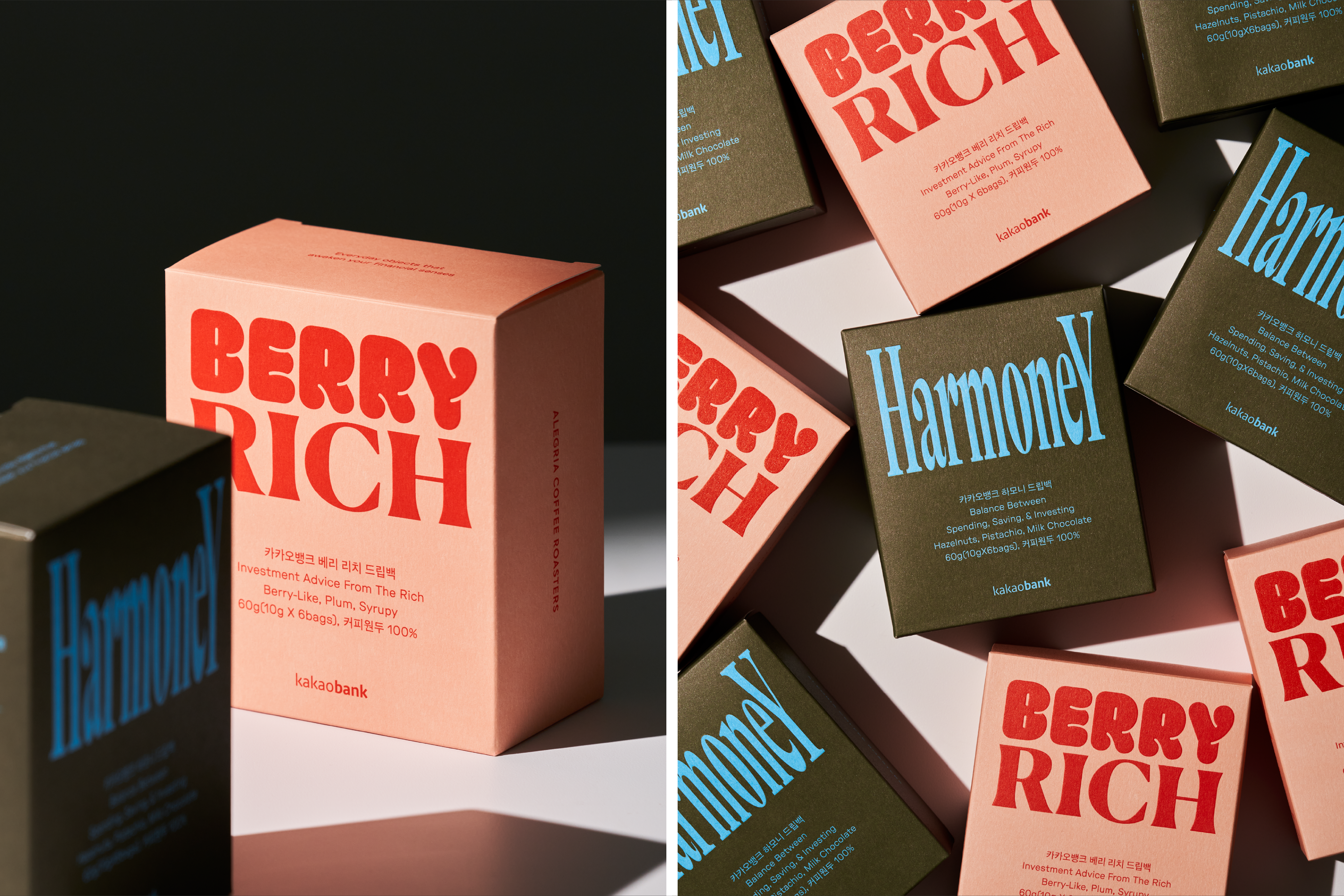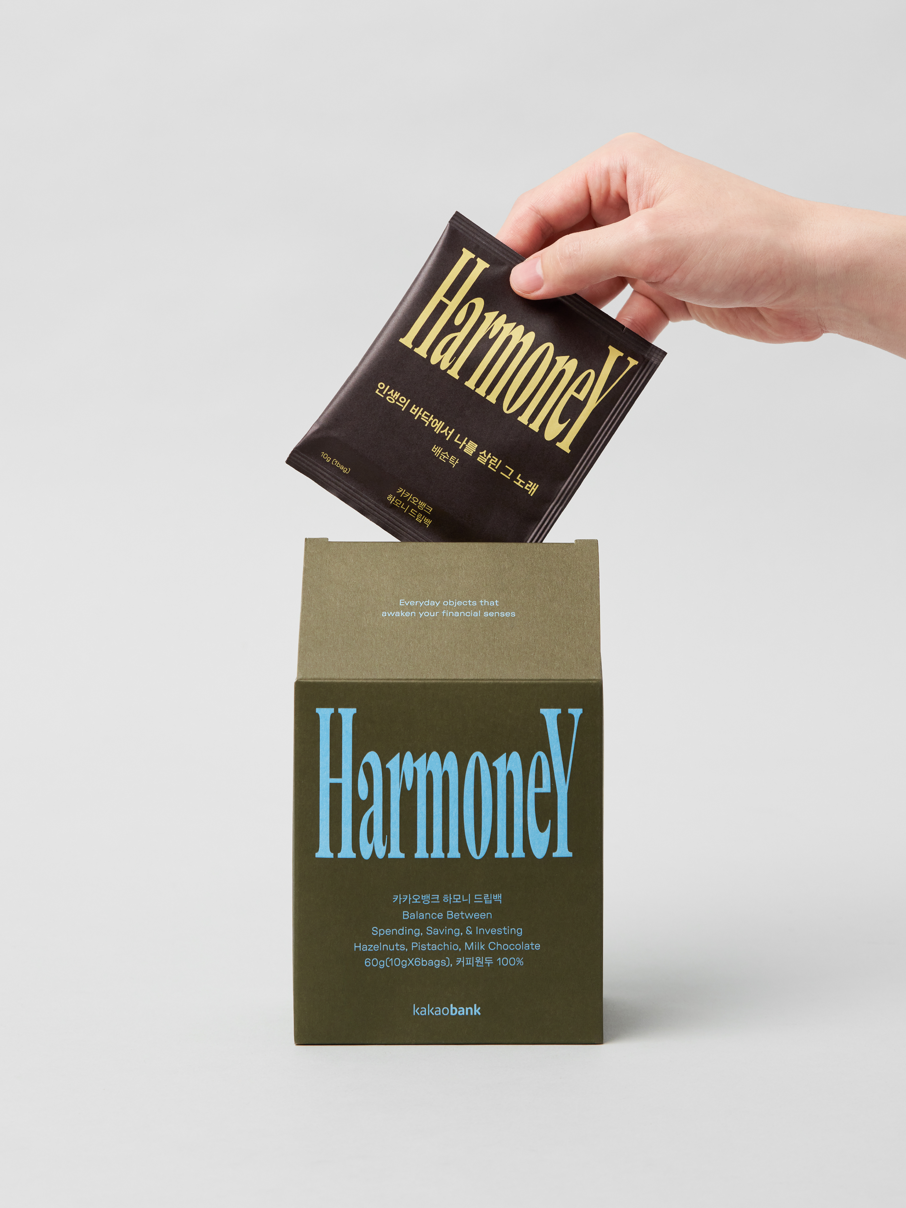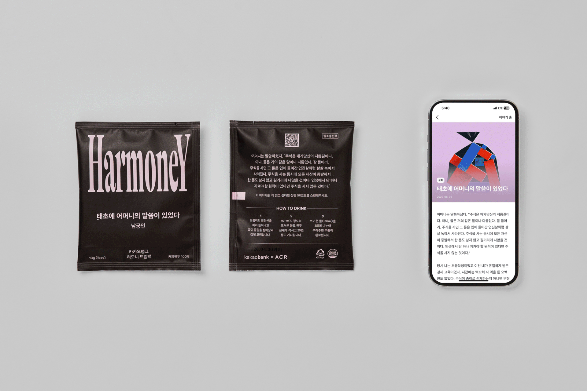 Kakaobank collaborated with ACR, a local roastery renowned for its specialty coffee, to develop its own signature blend. The blend is available in two distinct variations, named Harmoney and BerryRich, which are inspired by financial themes. Additionally, the 12-pack drip bag set is designed with QR codes that provide easy access to finance-related content.