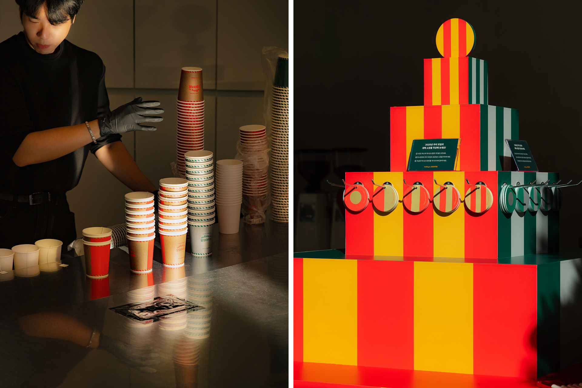 The design of ‘Holiday in Moim Agit’ builds upon the identity of 'Moim Agit' from 2023, with an enhanced concept to suit the holiday season. The five shapes representing the members were transformed into a more sparkling form, enhancing the festive atmosphere. Additionally, graphics combining these shapes with the holiday ornament stripe pattern were created to bring a vibrant and colorful vibe.