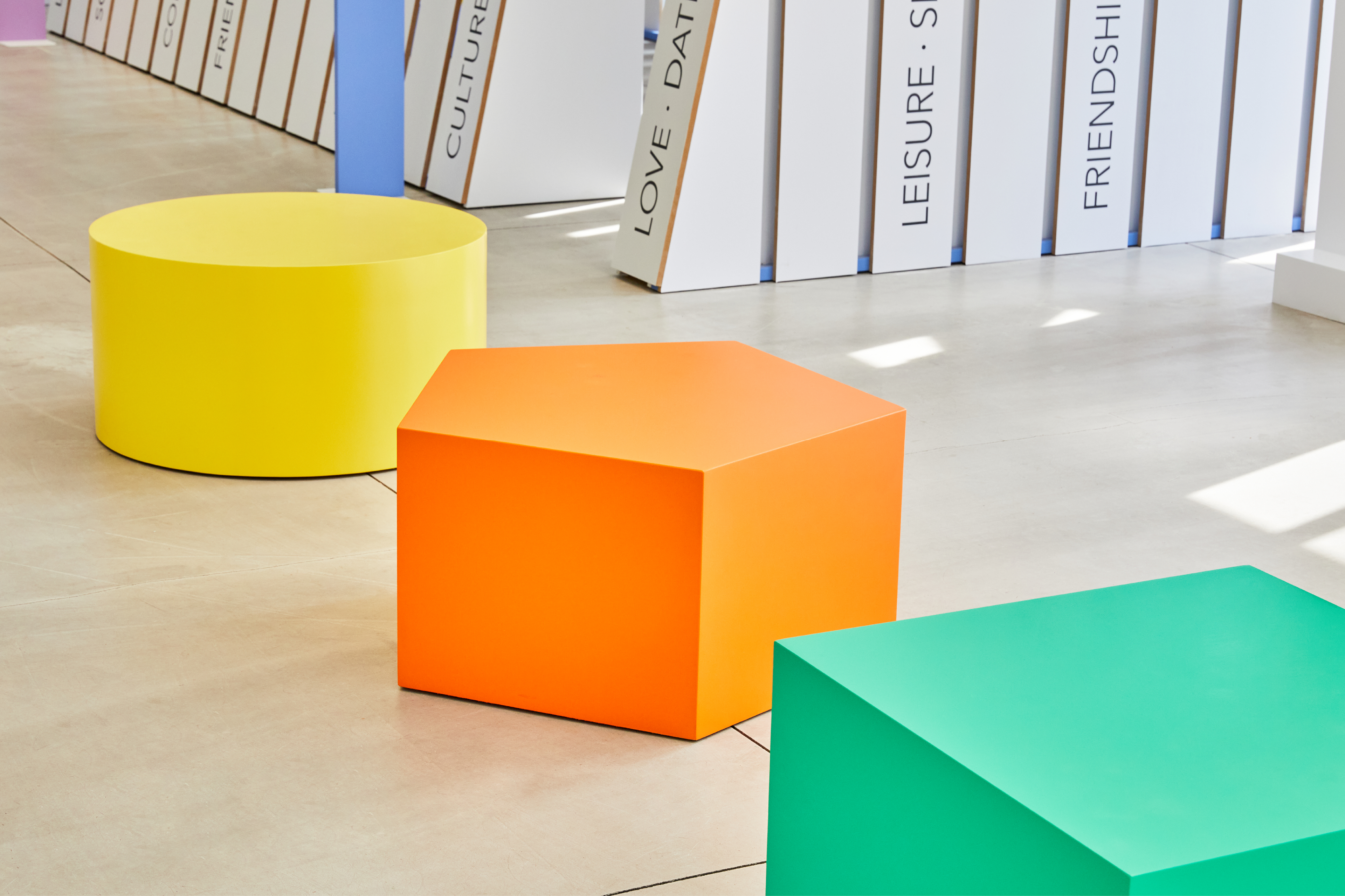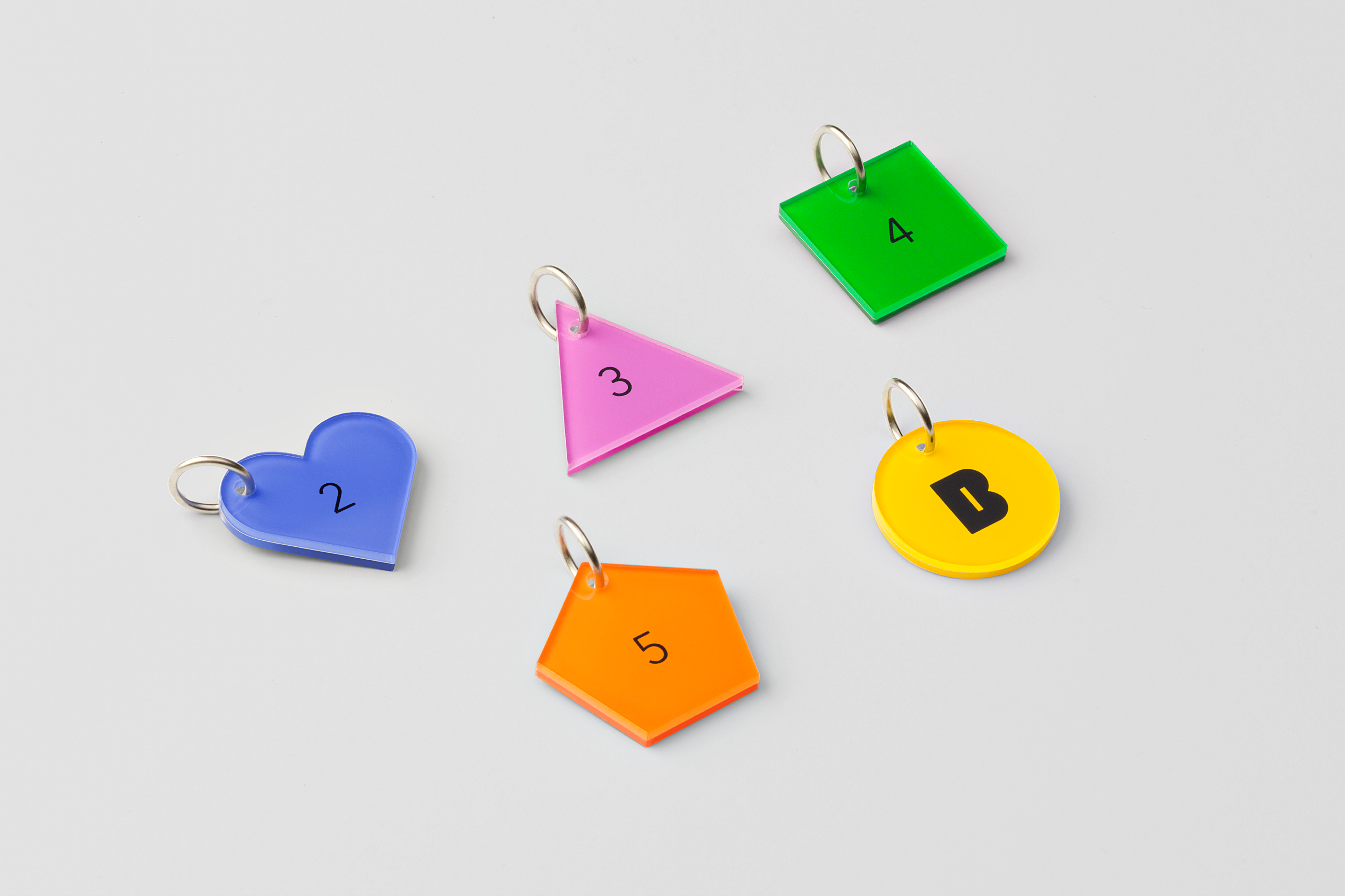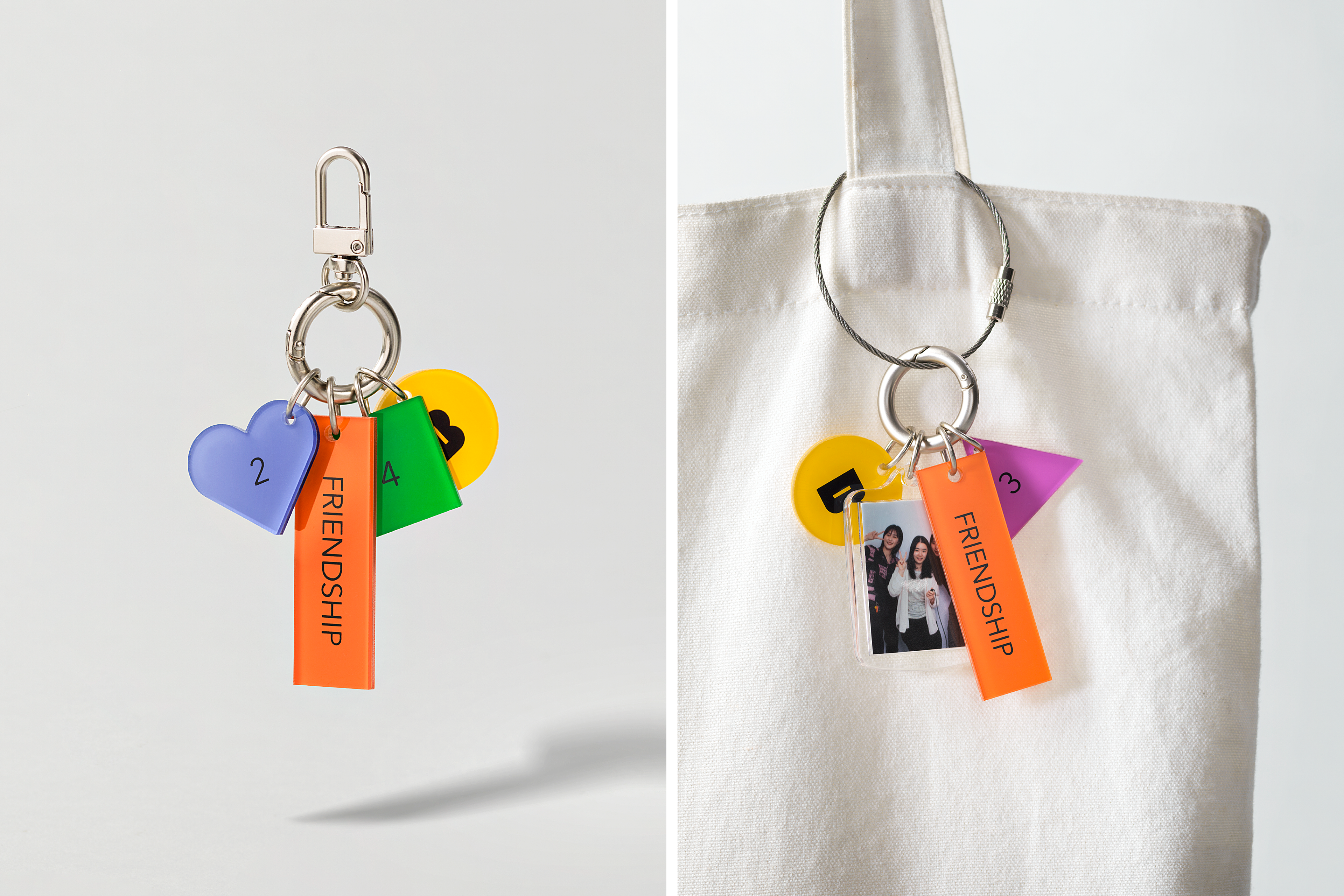 The venue evokes the image of a cabin, capturing the idea of a haven in its design. The primary visual element is designed to illustrate a range of unique and varied gatherings. This is achieved through a combination of five geometric patterns representing the number of group members and ten category tags. Customizable keyrings, integrating photo frames, distinctive visual shapes, and tag parts, can be tailored to reflect your group's unique character, further personalized with group name lettering to craft an exclusive accessory.