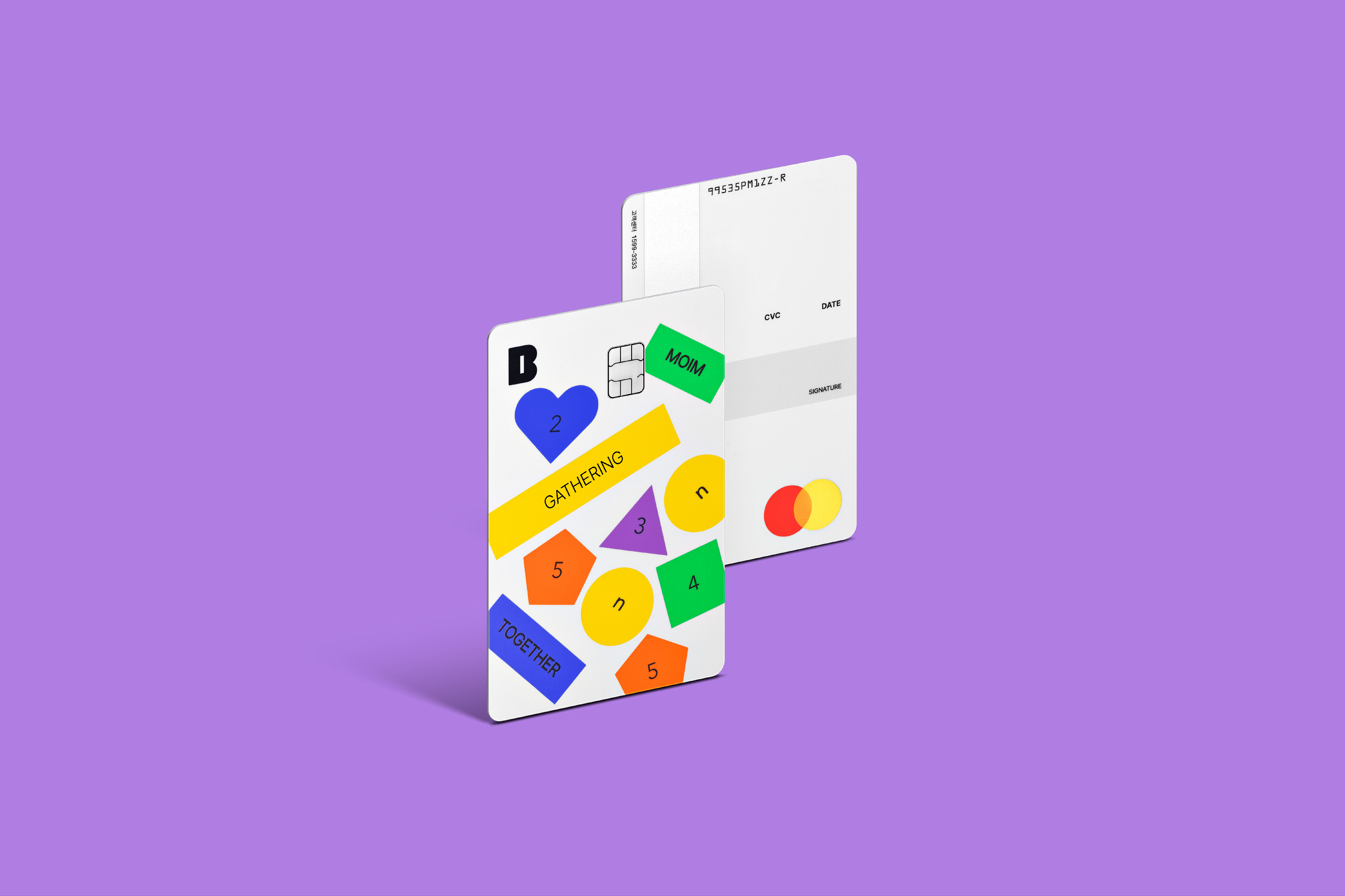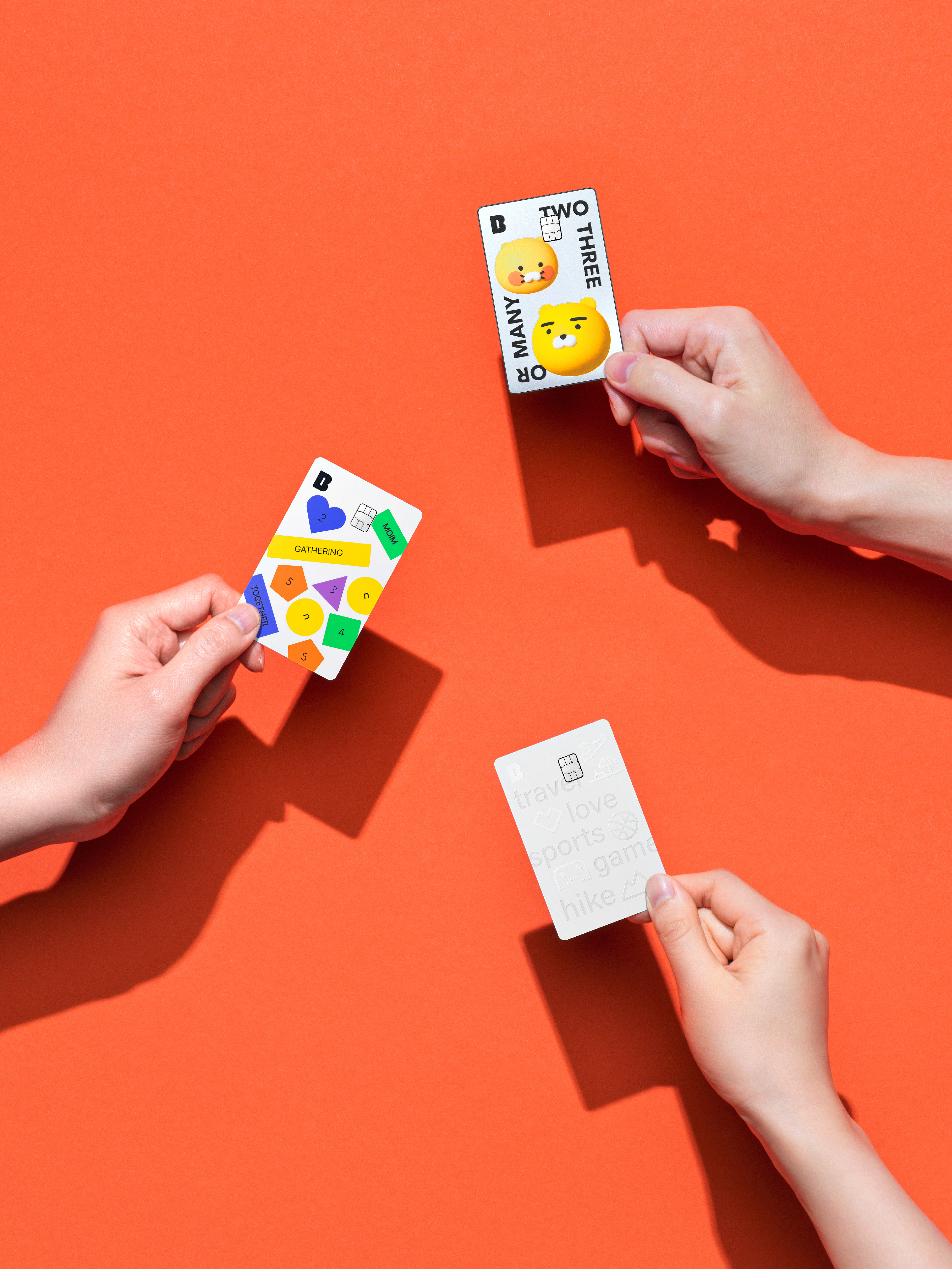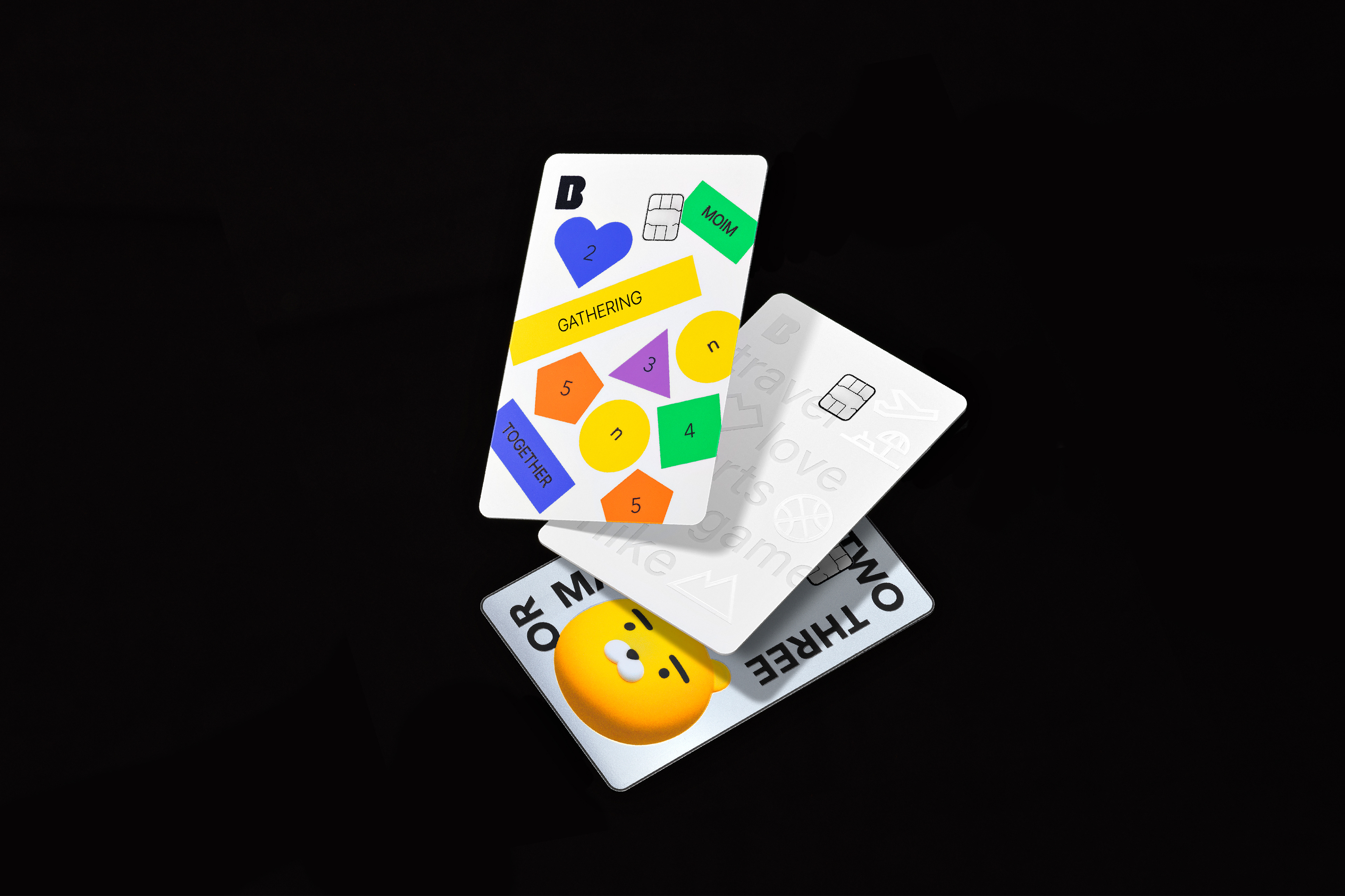 The card is offered in three types, each with unique design elements. Moim Together Card features a design that reflects the key visual of Kakaobank's meeting savings account through a combination of five geometric patterns representing the number of group members and ten meeting category tags.