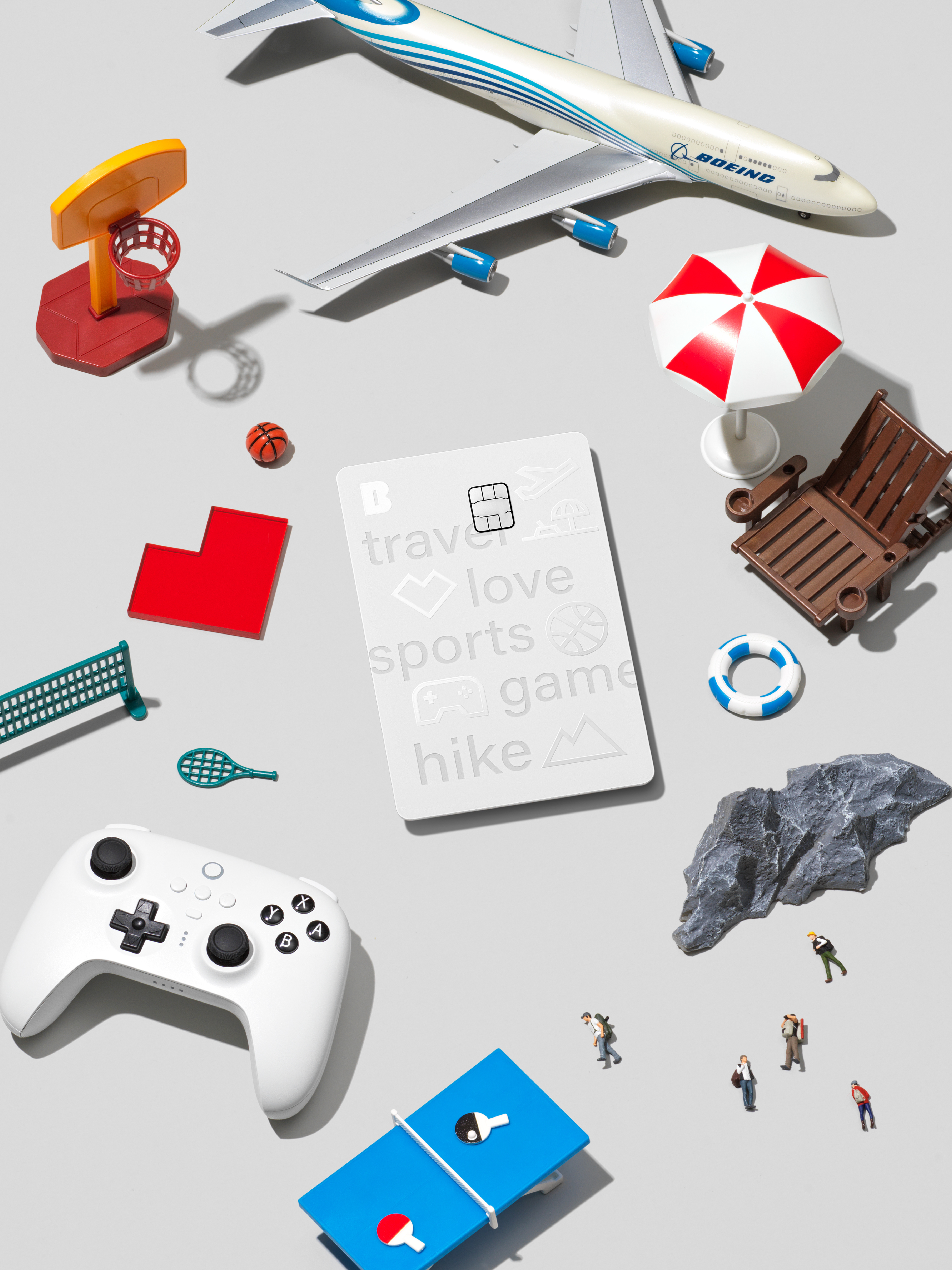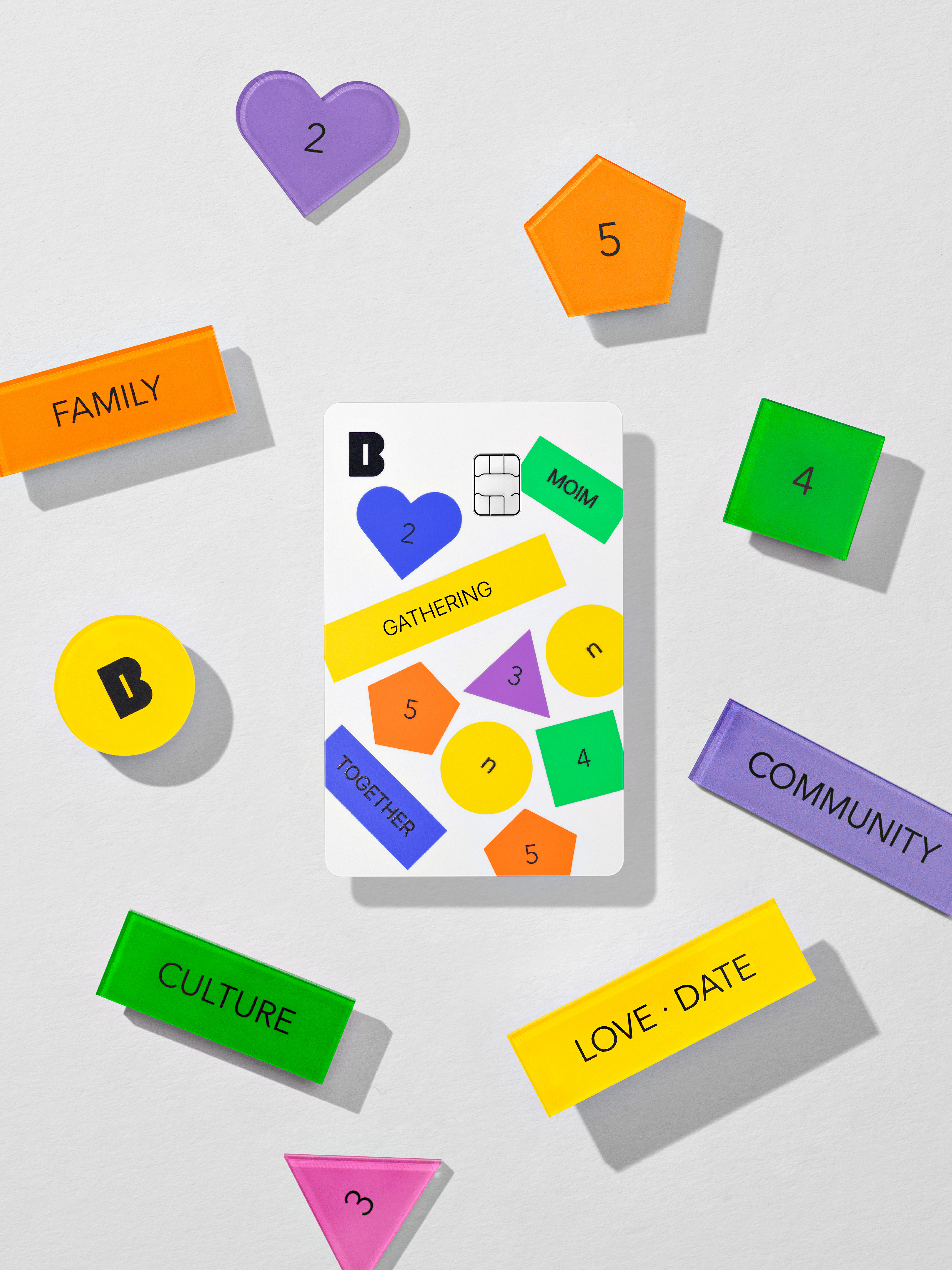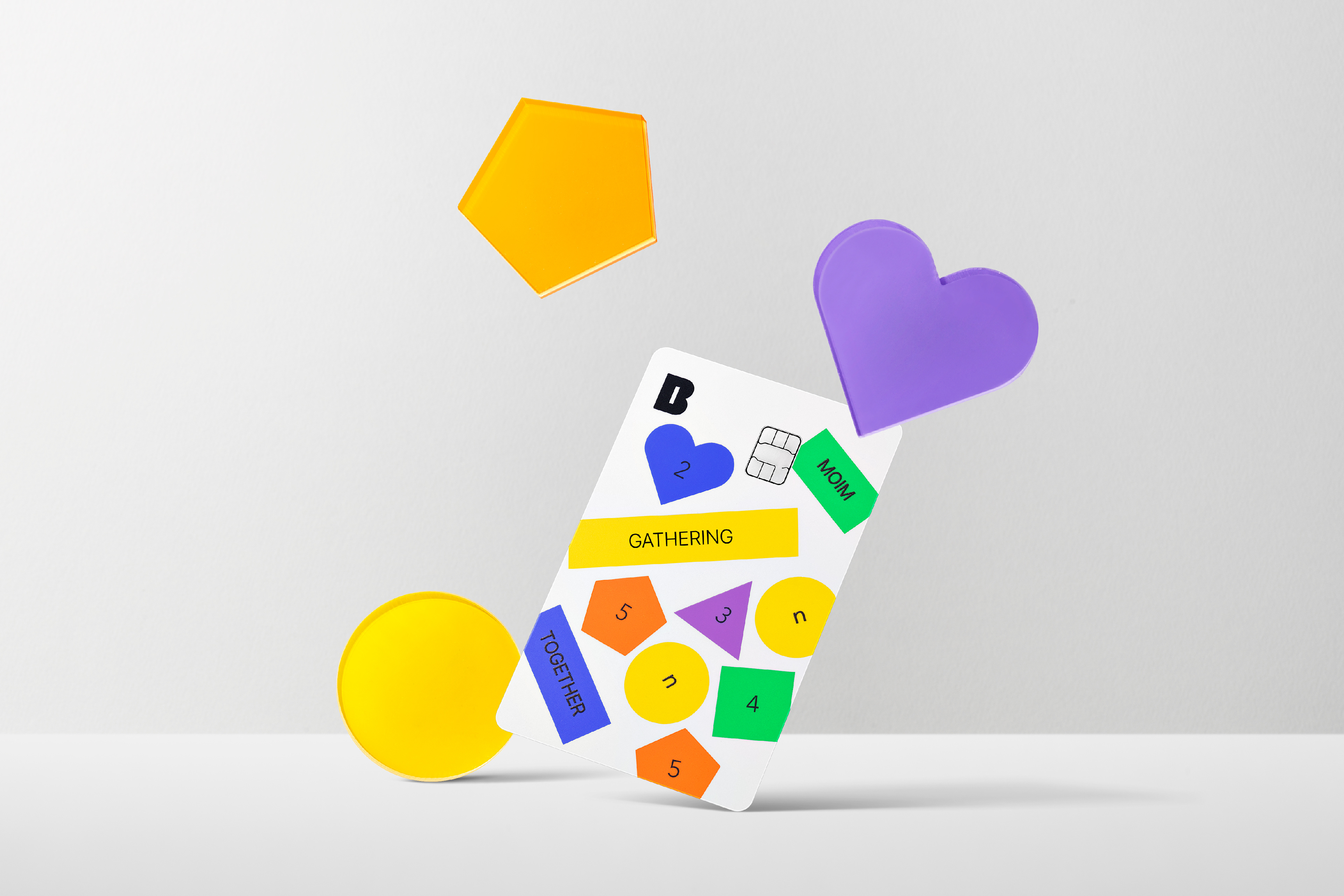 The card is offered in three types, each with unique design elements. Moim Together Card features a design that reflects the key visual of Kakaobank's meeting savings account through a combination of five geometric patterns representing the number of group members and ten meeting category tags.