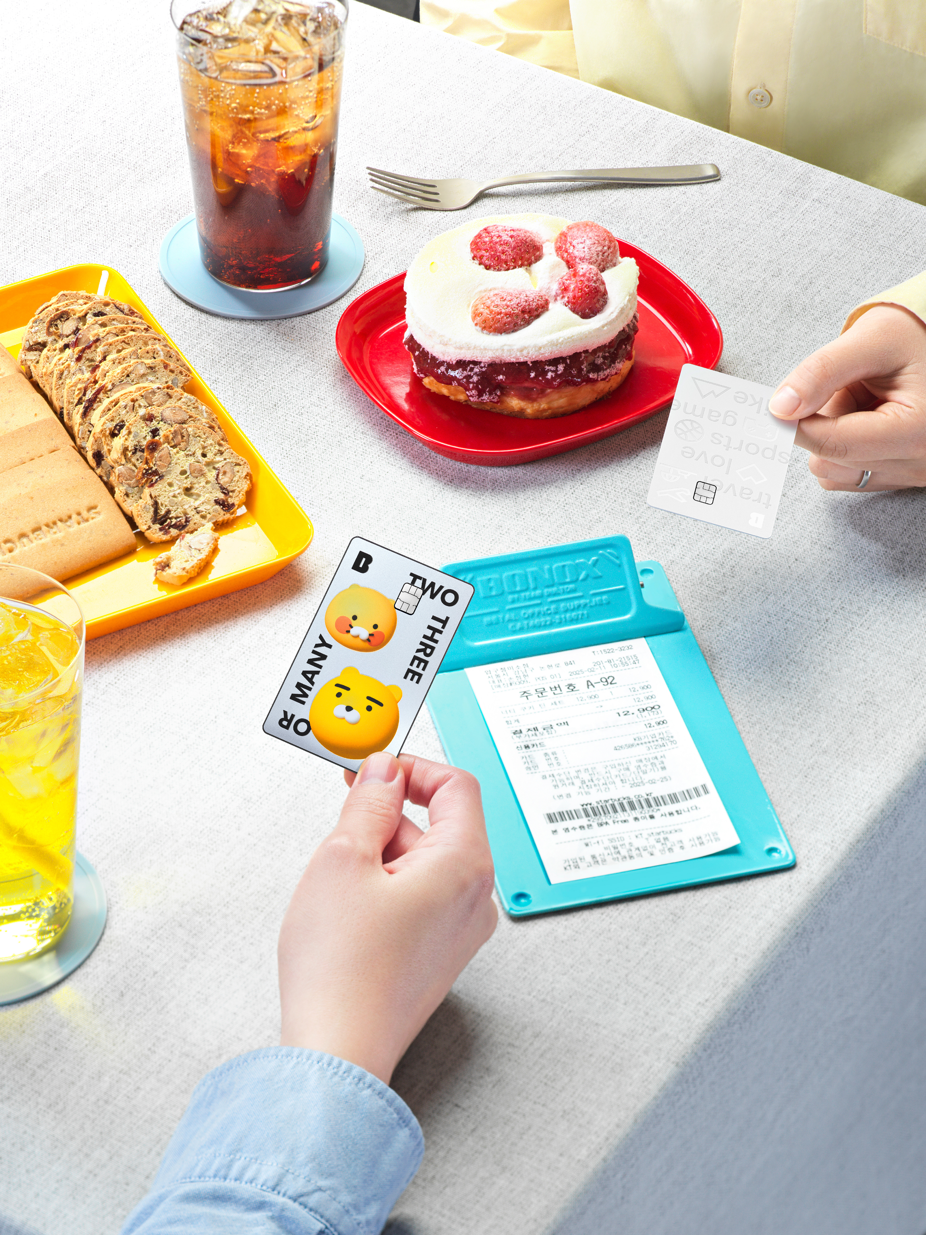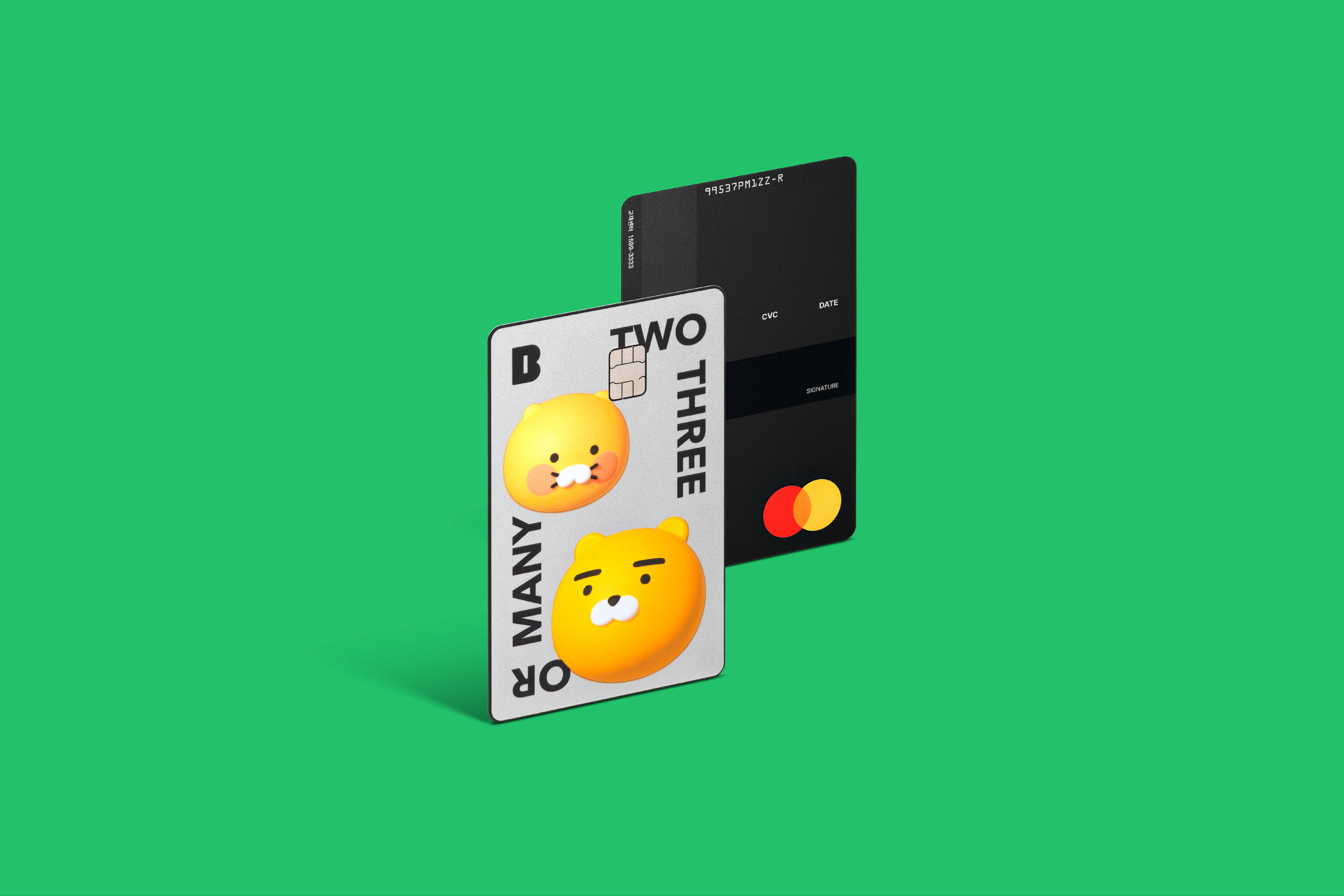 Moim Rachoon Card uses Kakao's representative characters, Ryan and Choonsik, and incorporates the slogan of the meeting savings account, "Two Three Or Many," into its design. Each card design offers a unique charm tailored to various meeting categories.