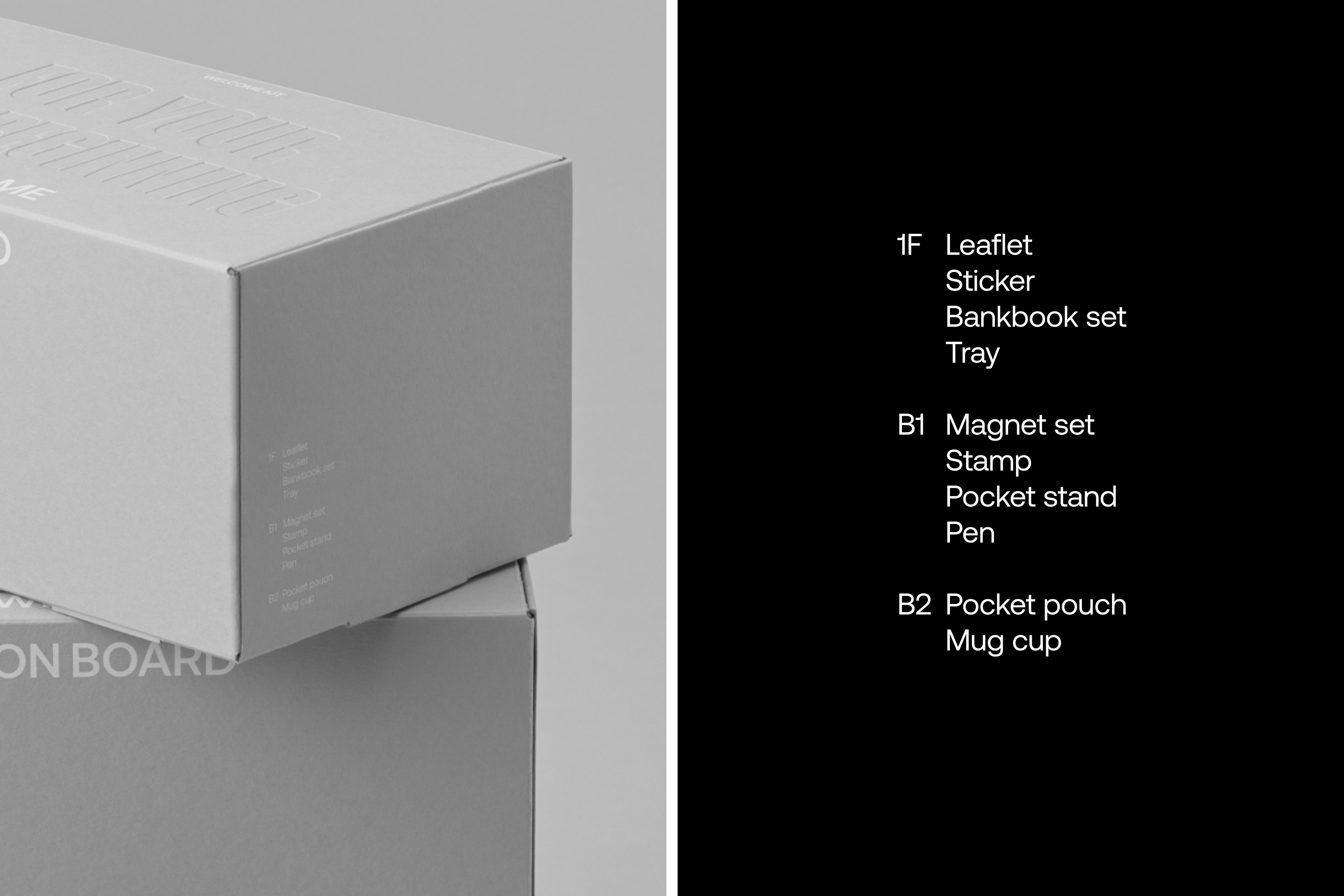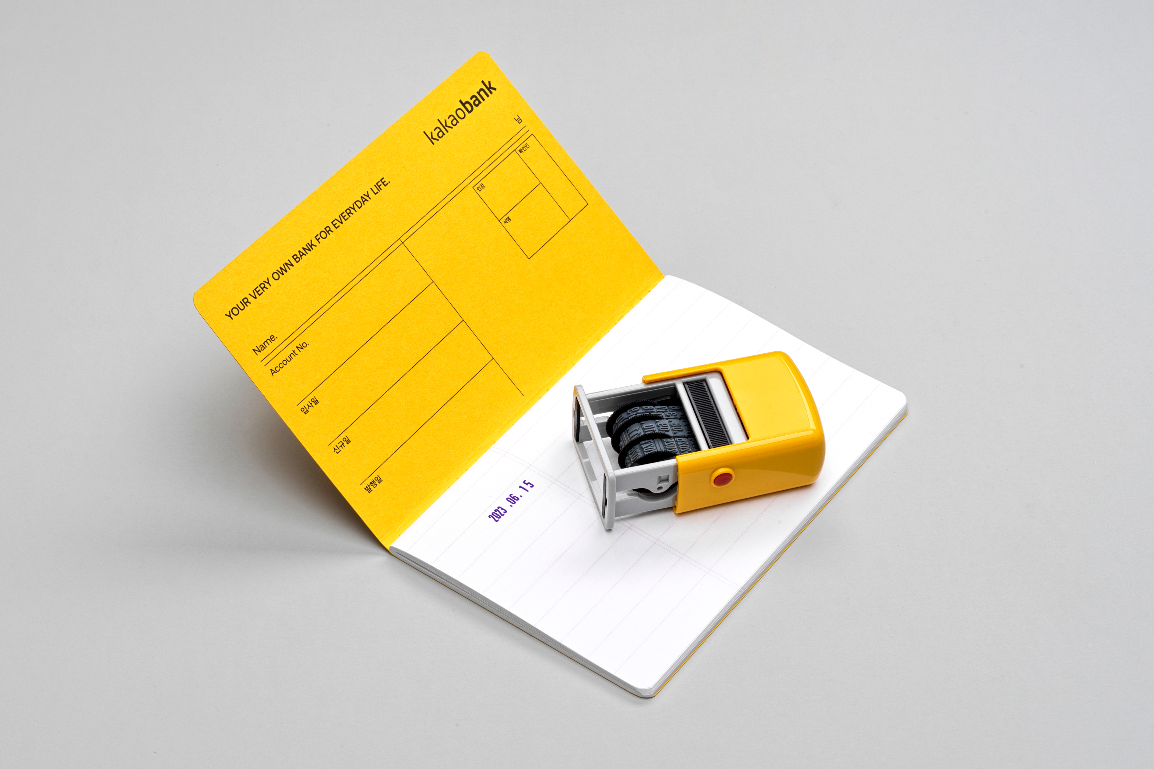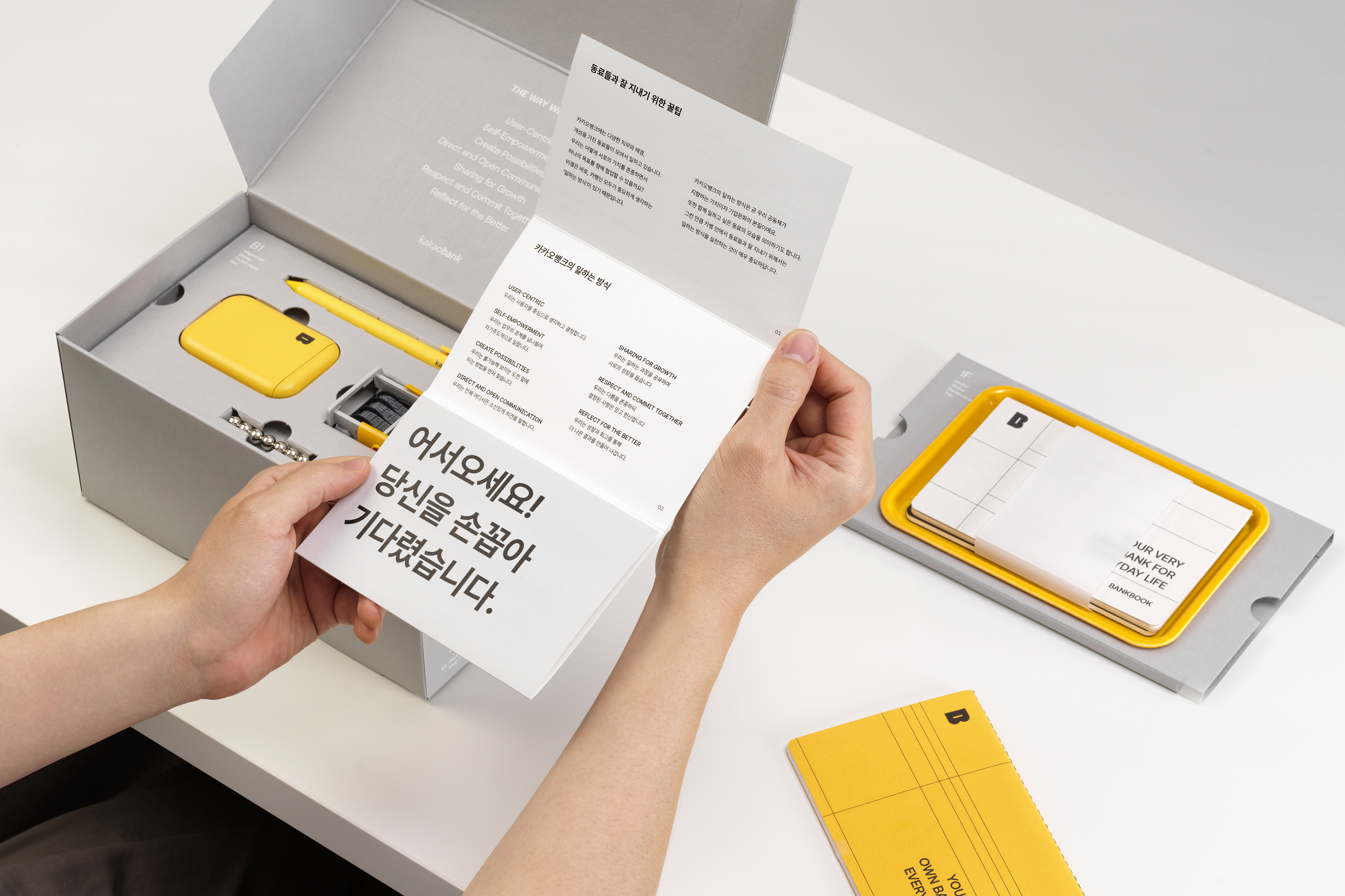 Given Kakaobank's distinct feature as an online bank without a physical presence, the Welcome Kit embodies the concept of delivering a tangible banking experience. It creatively transforms items typically encountered at traditional bank branches into practical office items, infused with contemporary wit. The paper bankbook is repurposed as a notebook, and the cash transaction tray takes on a new life as a versatile holder for various items or as a coaster.