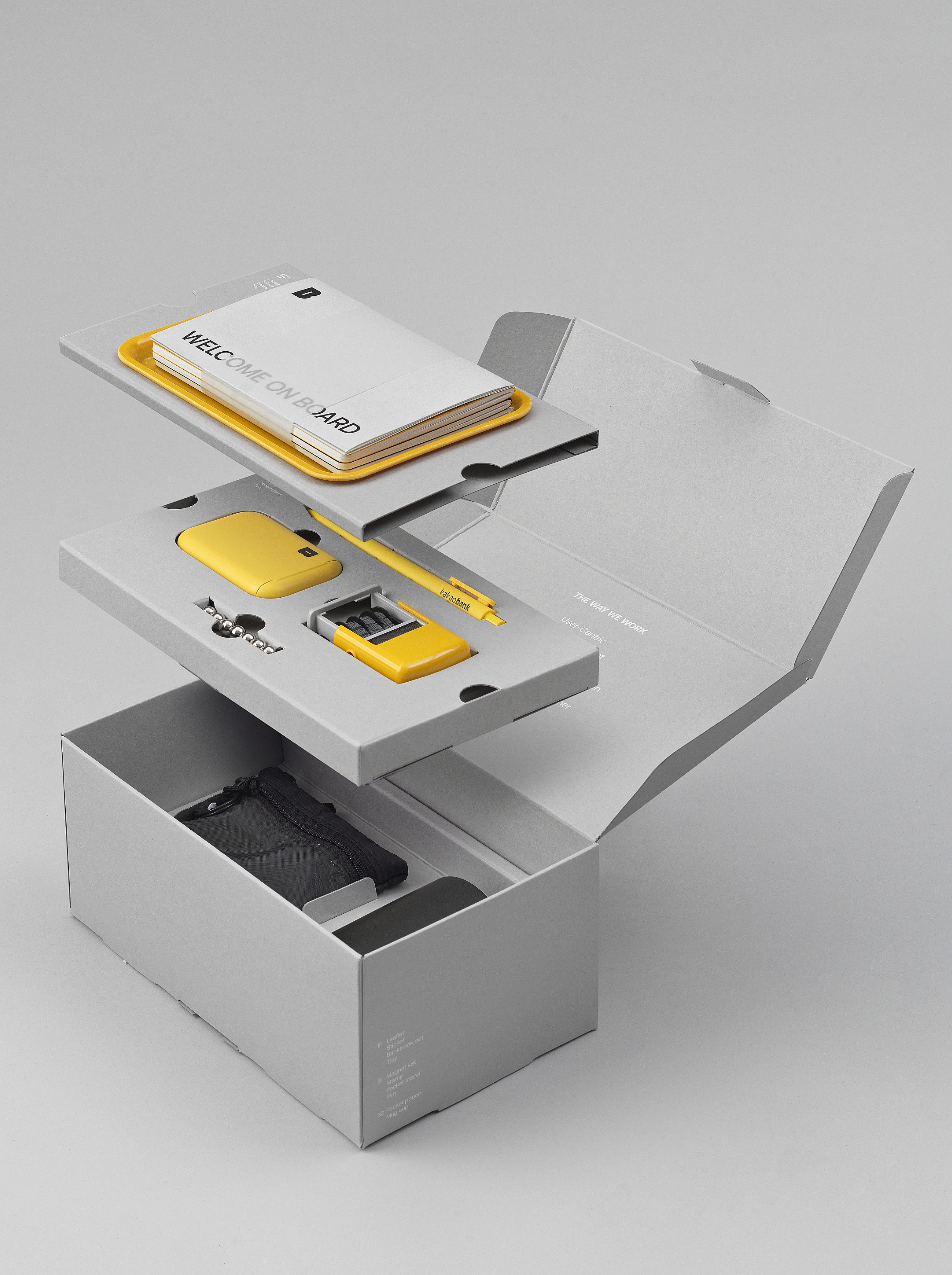 The Welcome Kit embodies the corporate identity with its use of yellow and black, our signature colors. Designed to be compact and reduce excess packaging, the three-tier structure of the kit heightens the anticipation and excitement of discovering its contents.