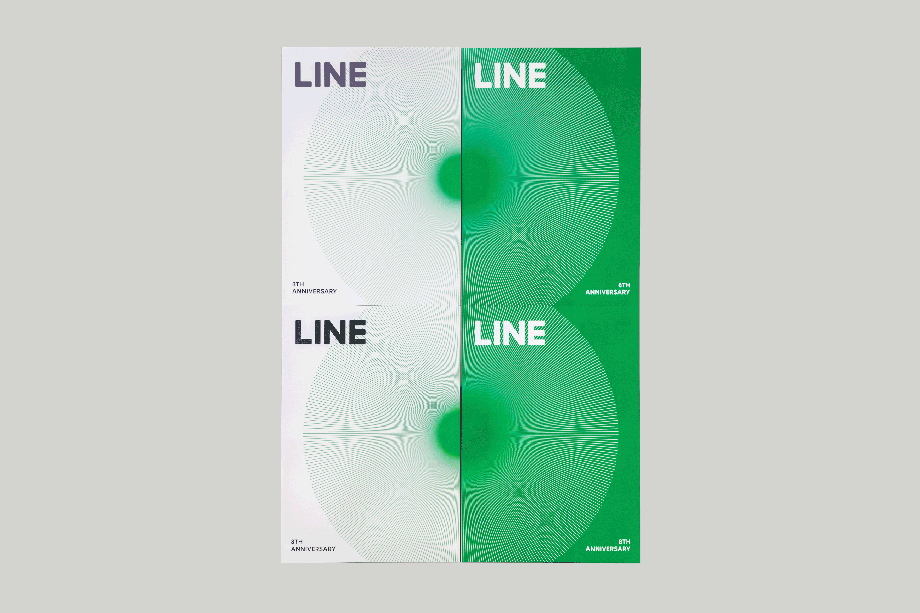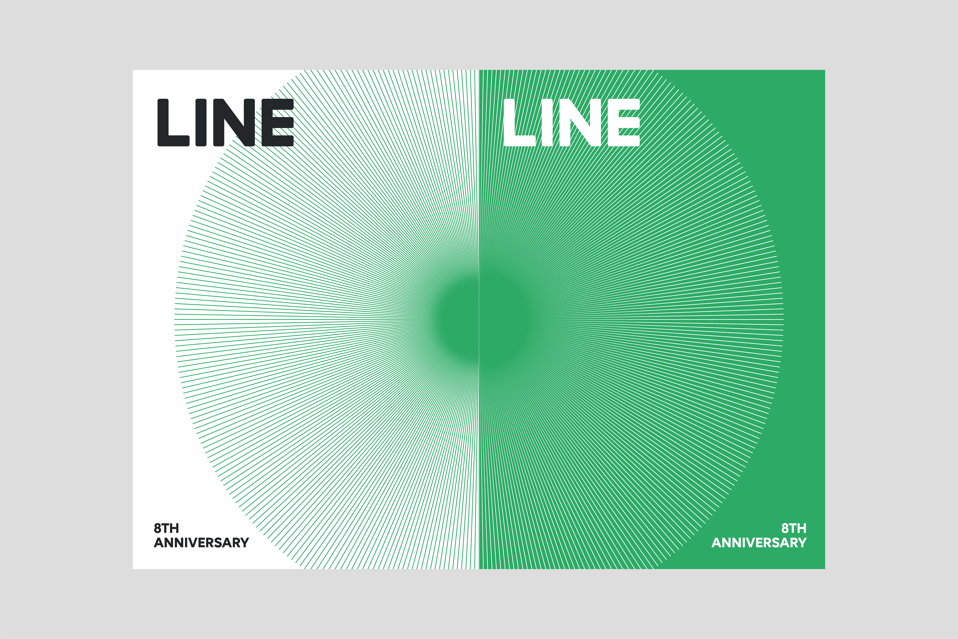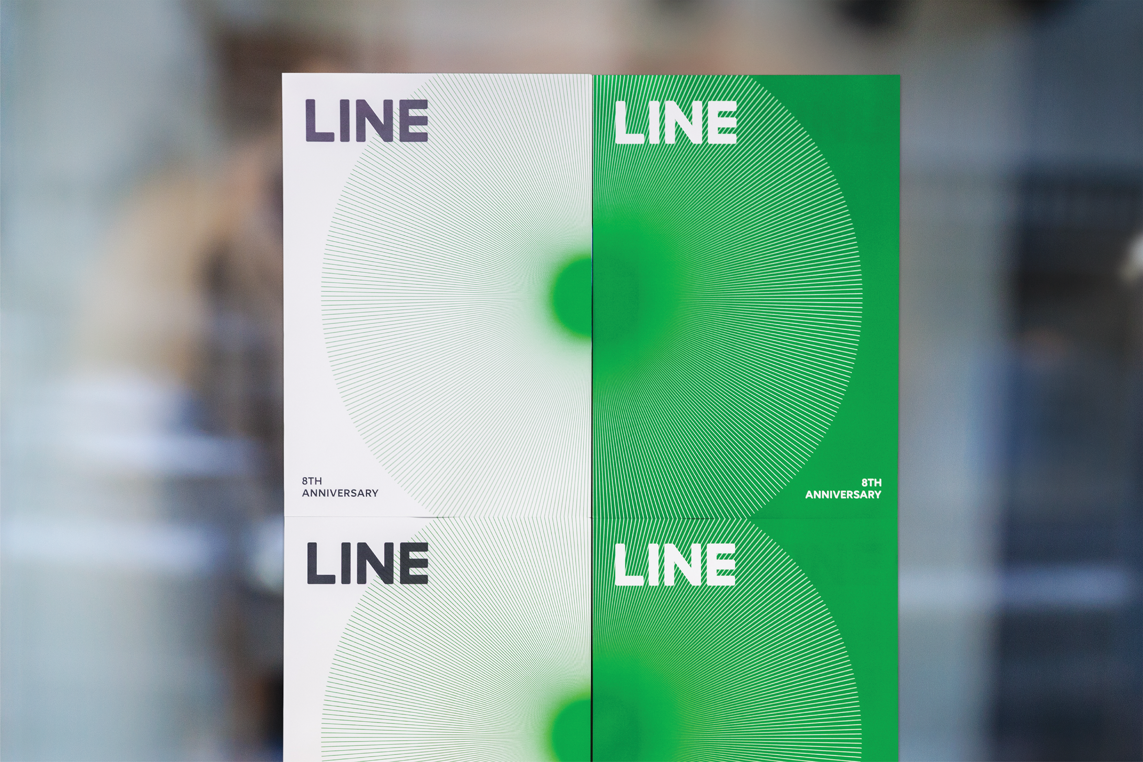 To celebrate LINE’s 8th anniversary, I developed a dedicated anniversary event identity and delivered a global celebration across 42 offices in 11 countries through product and spatial branding. The key visual was created by combining the number 8 with LINE’s brand identity. Inspired by LINE’s motto, “Closing the distance,” the visual concept expresses how multiple lines converge toward a single point and form a circle—symbolizing the way information and people come together, connect, and communicate. This process was abstracted and visualized through the shape of the number 8.