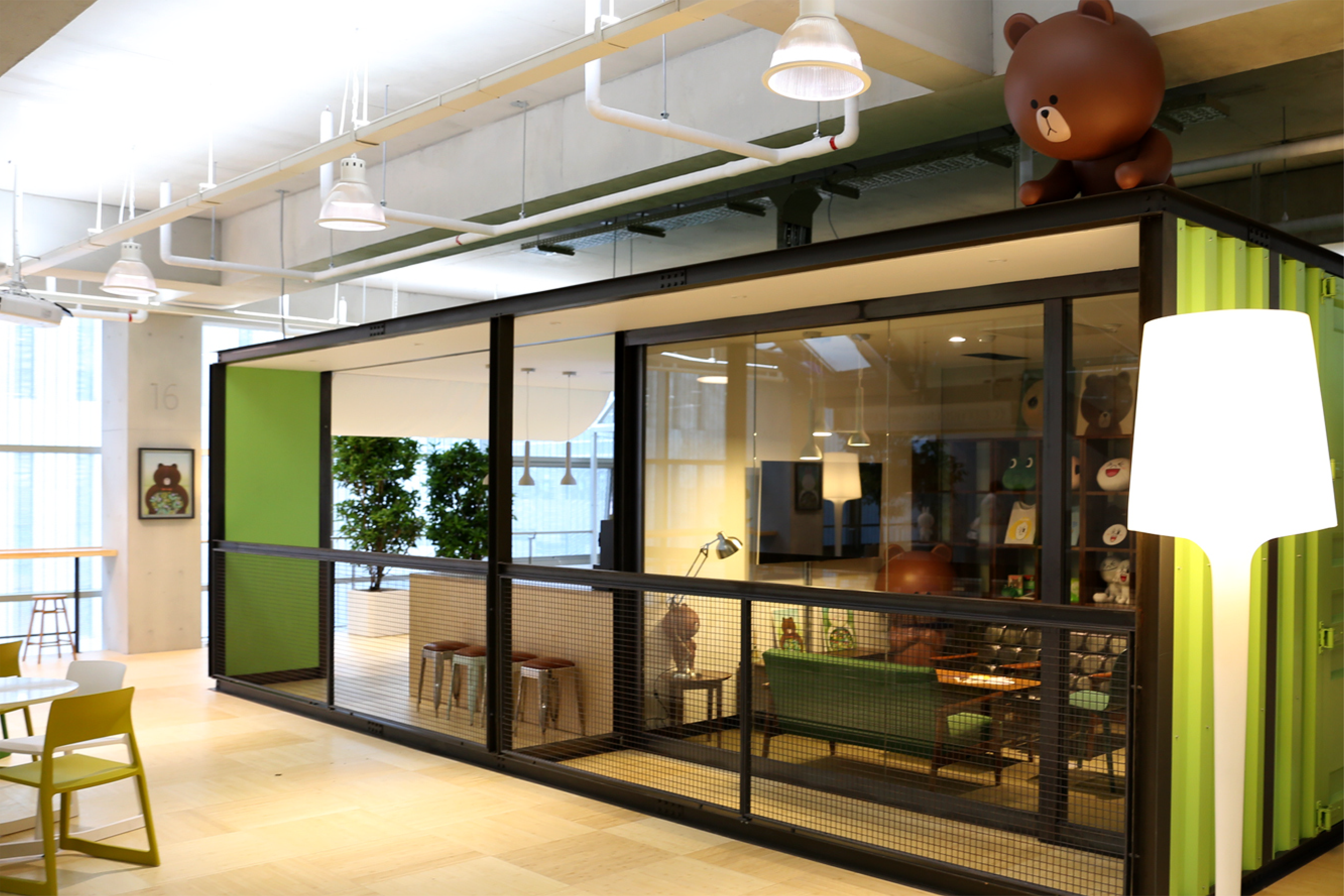 Furthermore, the office was designed as an extended showroom and exhibition space. Mock-ups and samples from the product development process are strategically placed throughout the office, naturally sharing the journey of LINE FRIENDS products. This project realizes LINE's unique identity—a place where work, communication, and brand experience are seamlessly interconnected.
