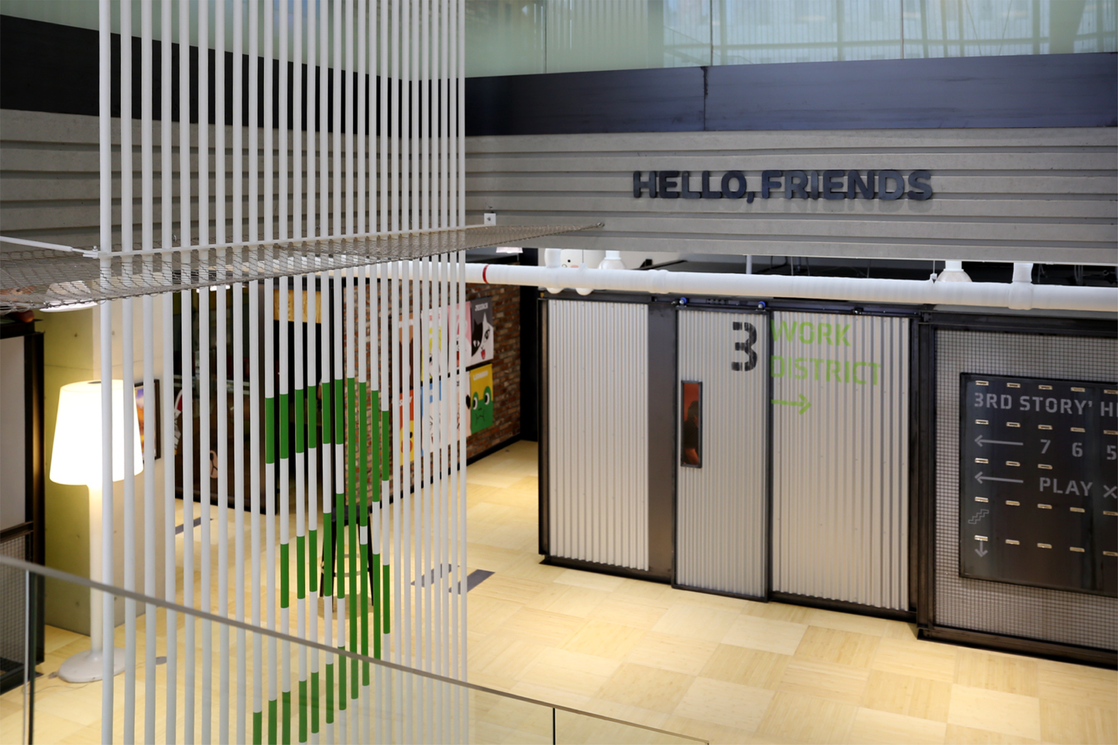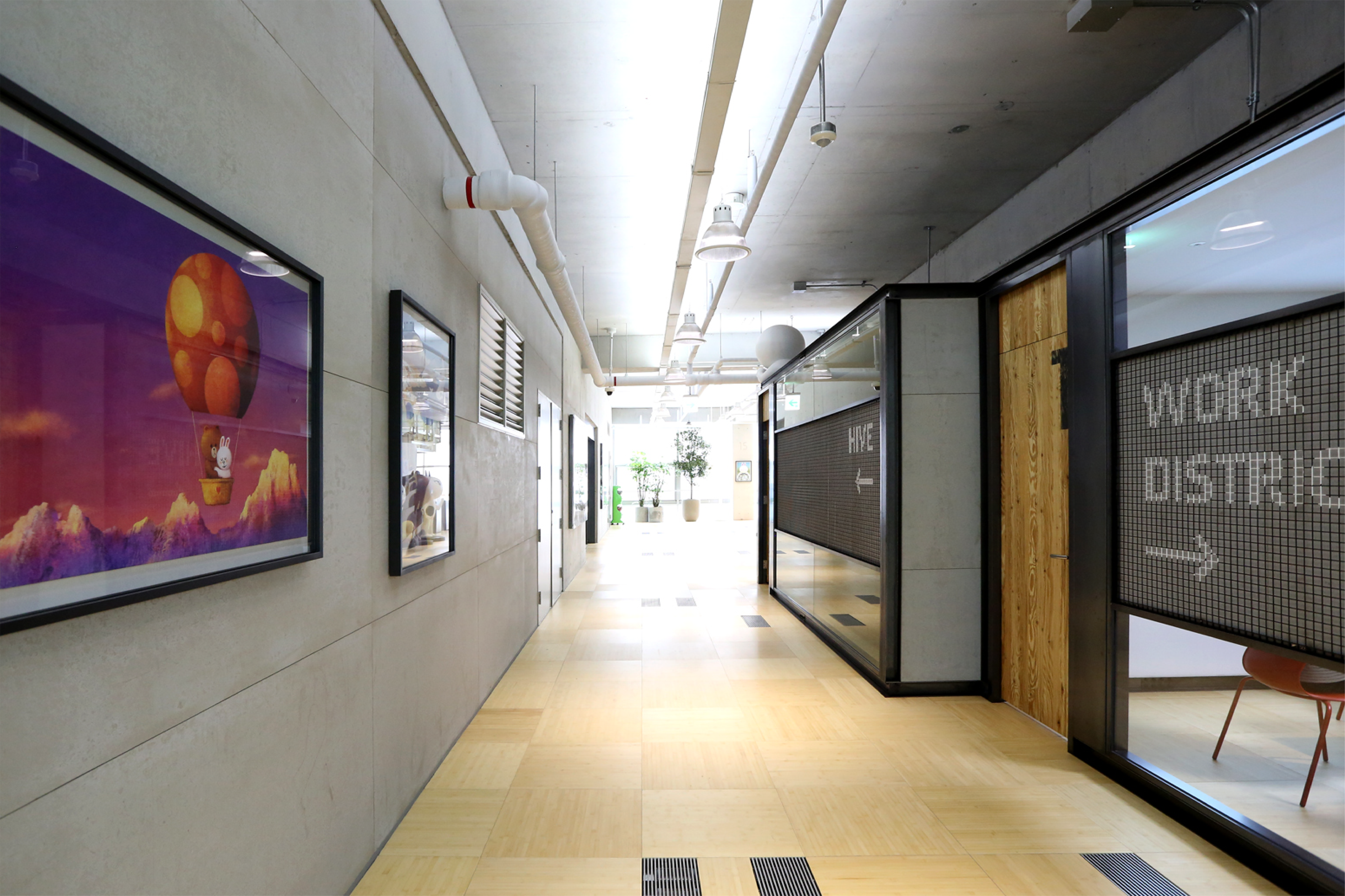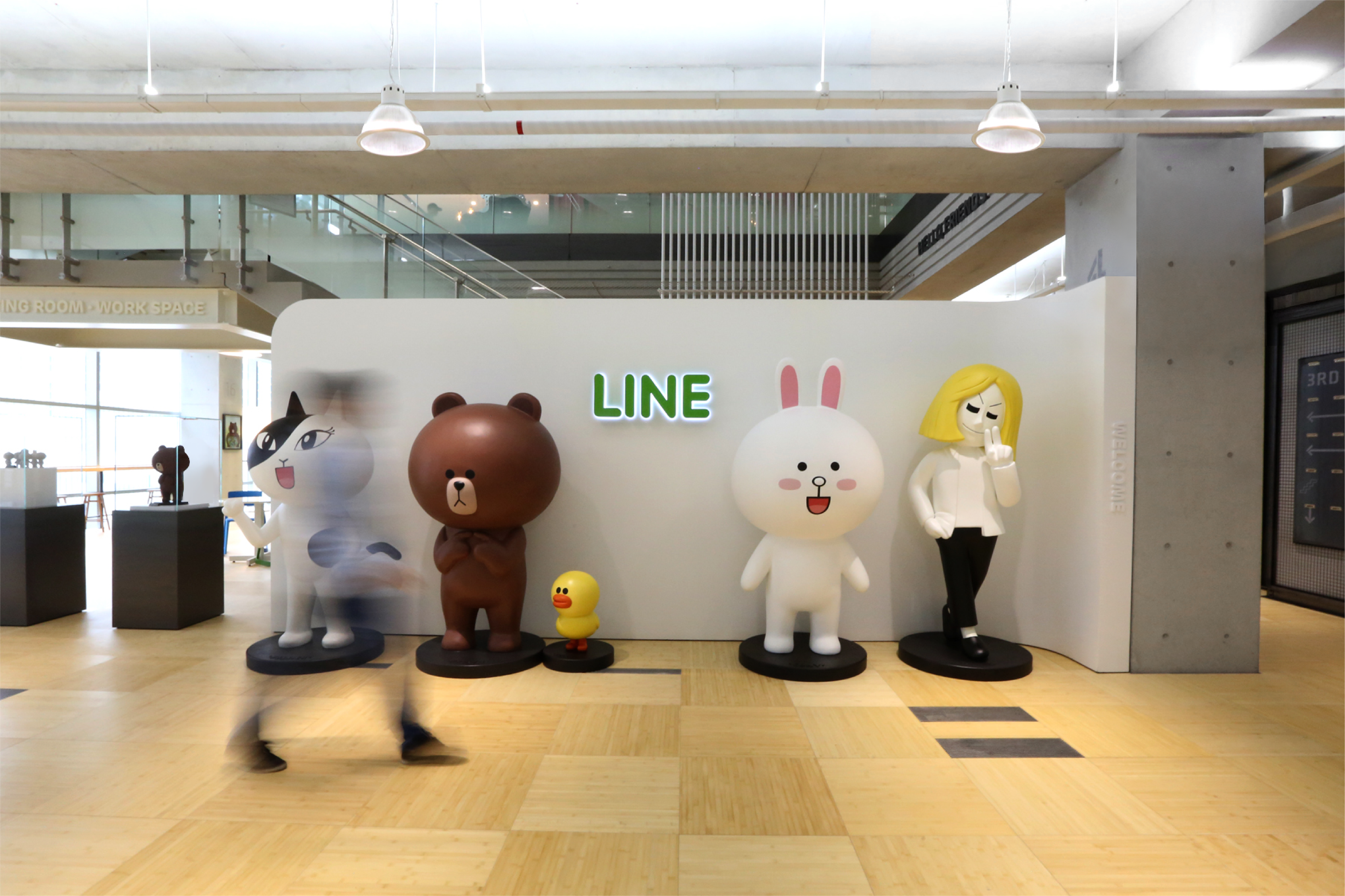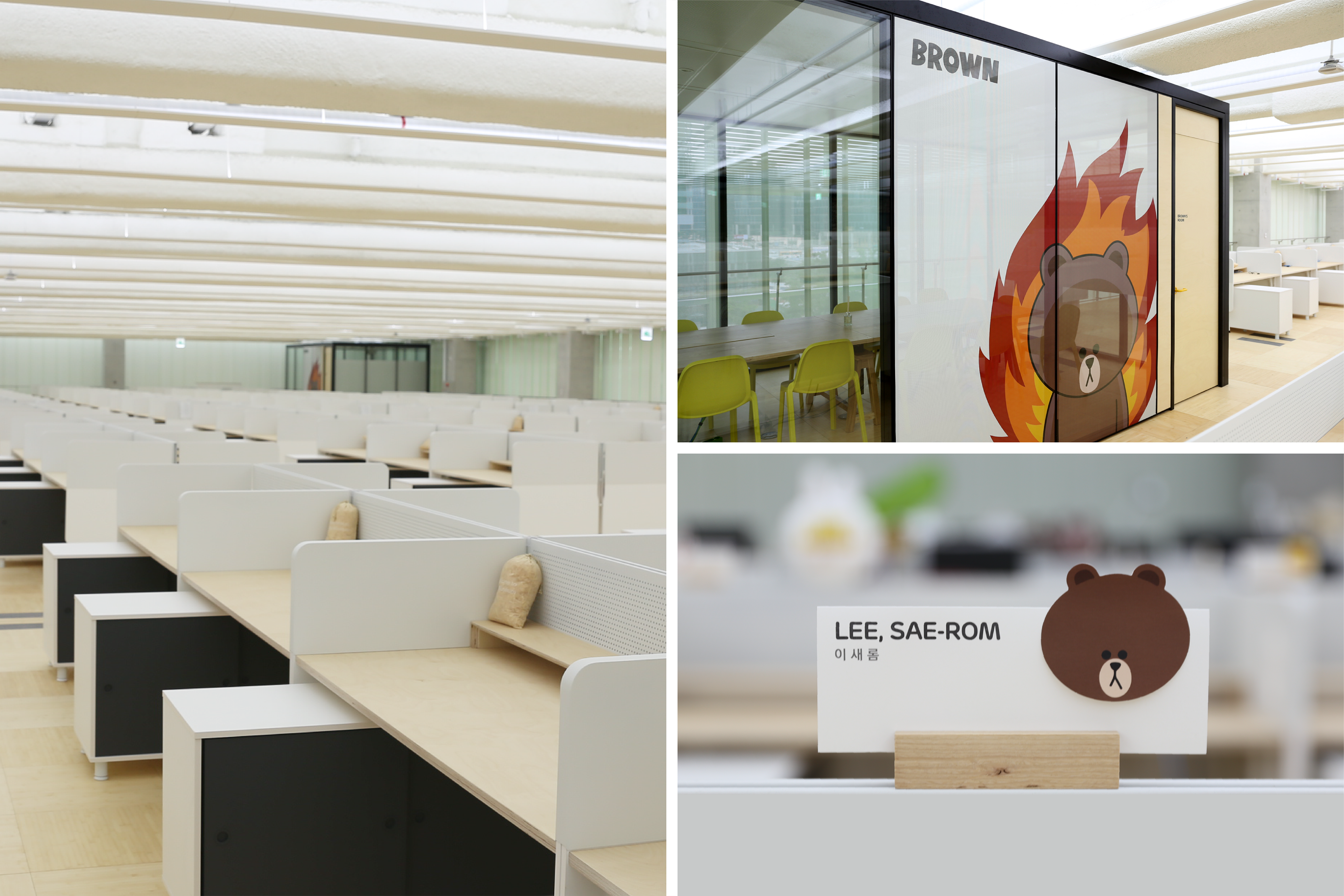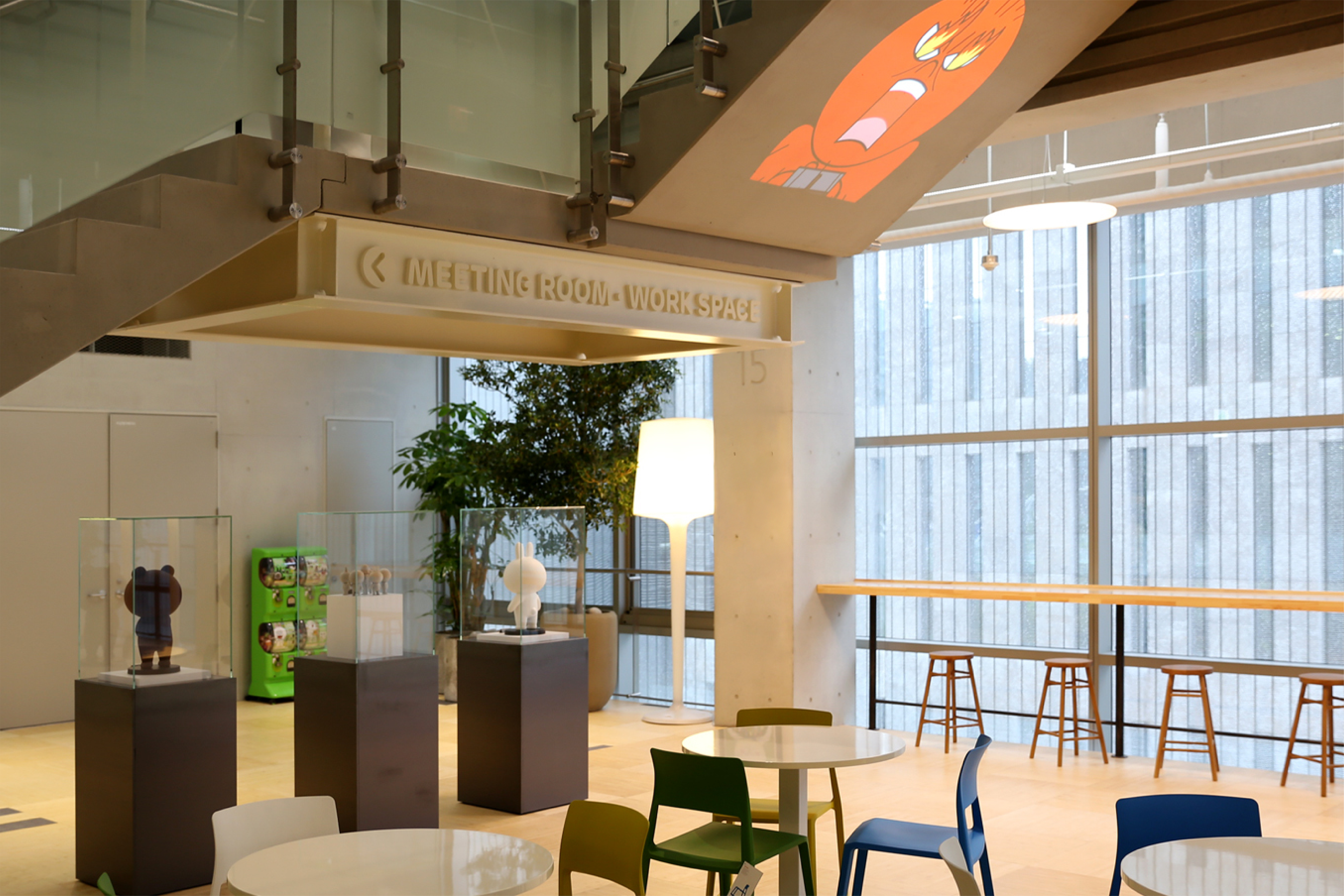 The overall space reflects LINE's signature wit and friendly brand tone, transforming a routine workplace into an open, community-driven office. Notably, we integrated LINE FRIENDS characters as active spatial elements, delivering a unique brand experience where the characters feel as though they are co-existing with the employees.