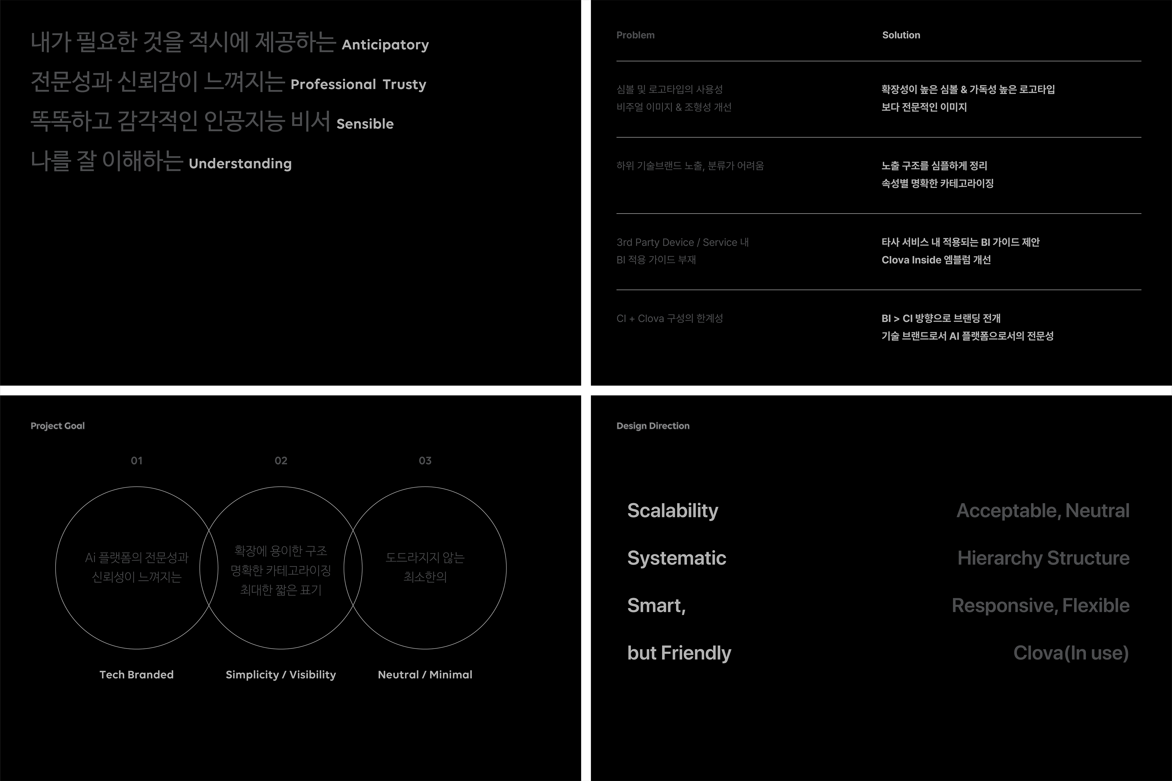 Centered around the core logotype and symbol, this rebranding project focused on strengthening CLOVA’s professionalism and credibility as both a technology brand and an AI platform, establishing a more cohesive and reliable brand presence.