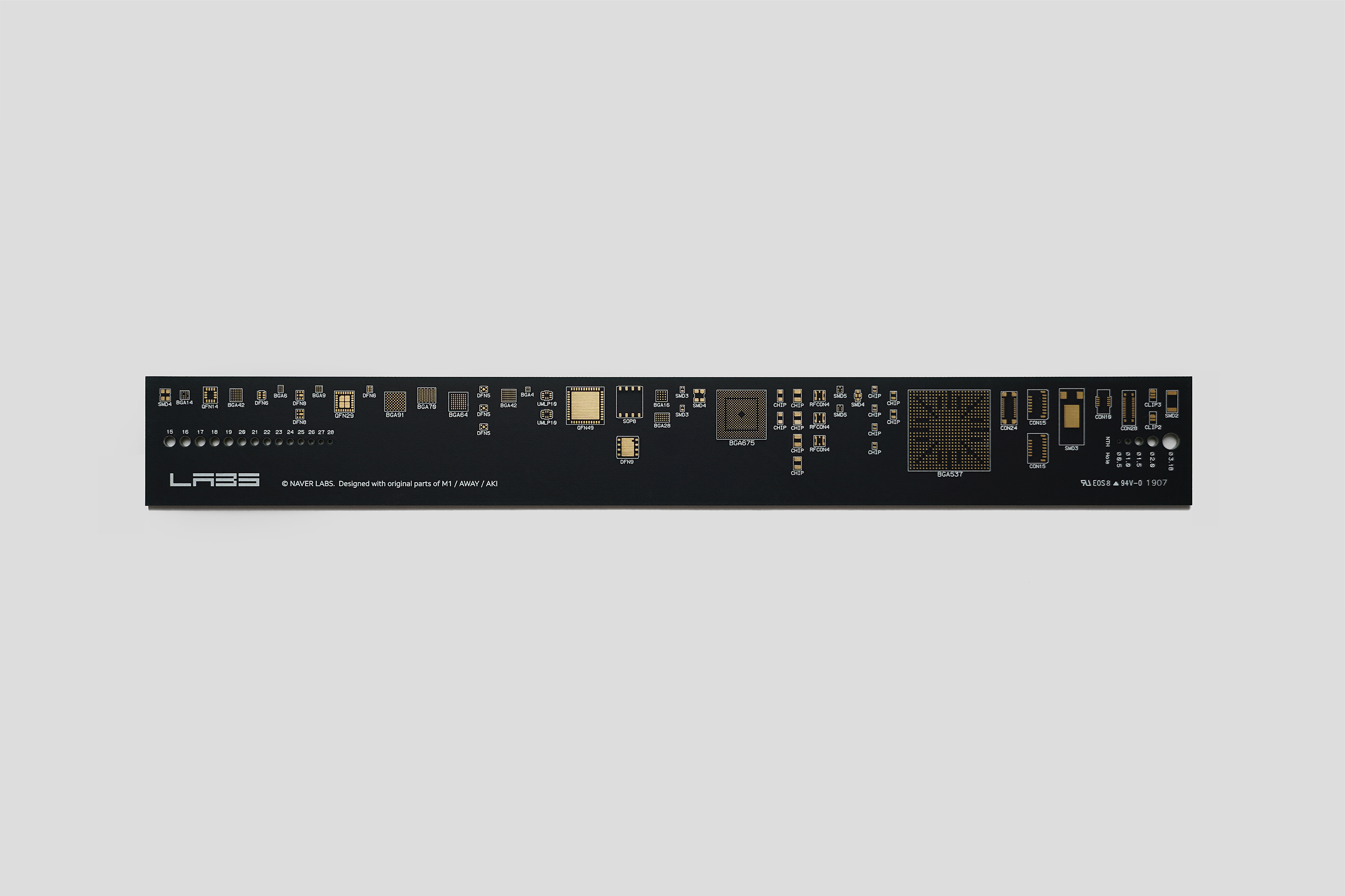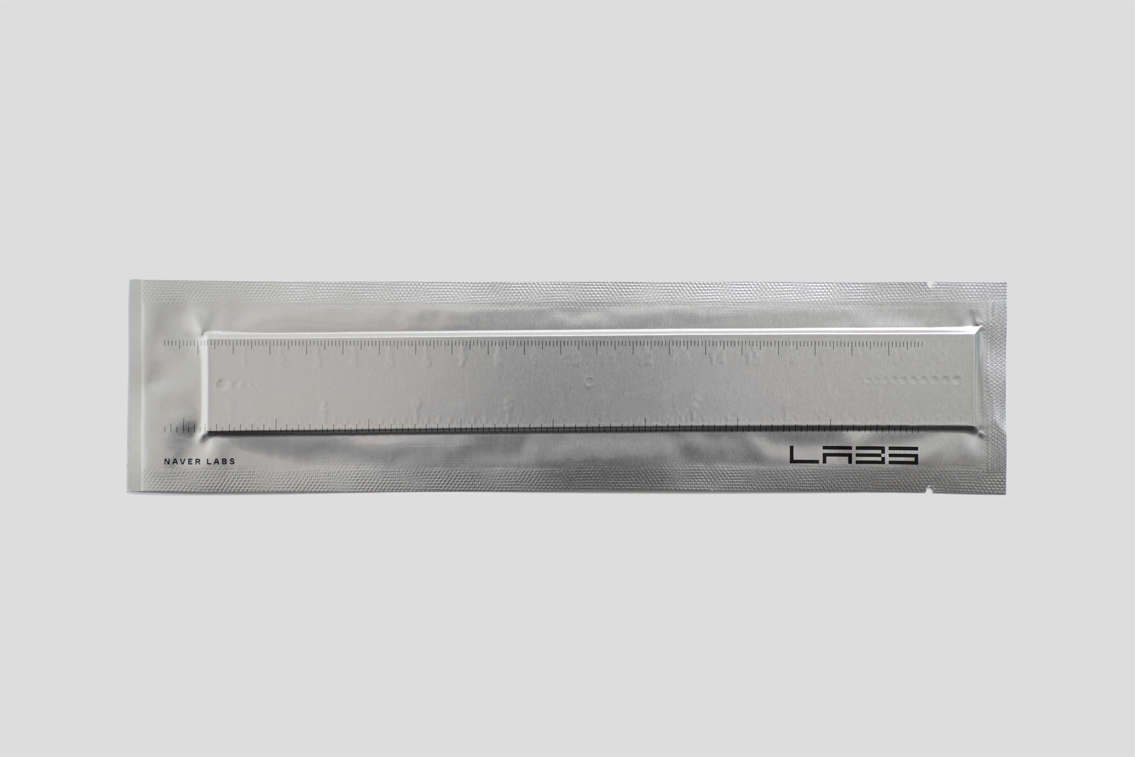 This project was undertaken with the goal of developing a branded product that conveys both technical expertise and trust, grounded in NAVER LABS’ technology philosophy. To communicate robot- and hardware-driven innovation in a more intuitive way, a PCB Ruler was conceived and produced using actual components from NAVER LABS hardware, and was distributed as a giveaway at recruitment events as well as internal and external occasions. Select original parts from NAVER LABS’ physical products—M1, AWAY, and AKI—were extracted and reinterpreted into a pattern that symbolizes mobility, then designed and applied with careful consideration of the structural logic of real PCB boards. For packaging, the aluminum pouch used in the actual manufacturing and distribution process of PCB devices was repurposed and vacuum-sealed, reinforcing the product’s technical credibility while enhancing its sense of realism.