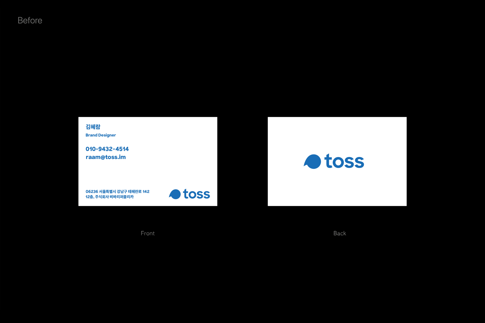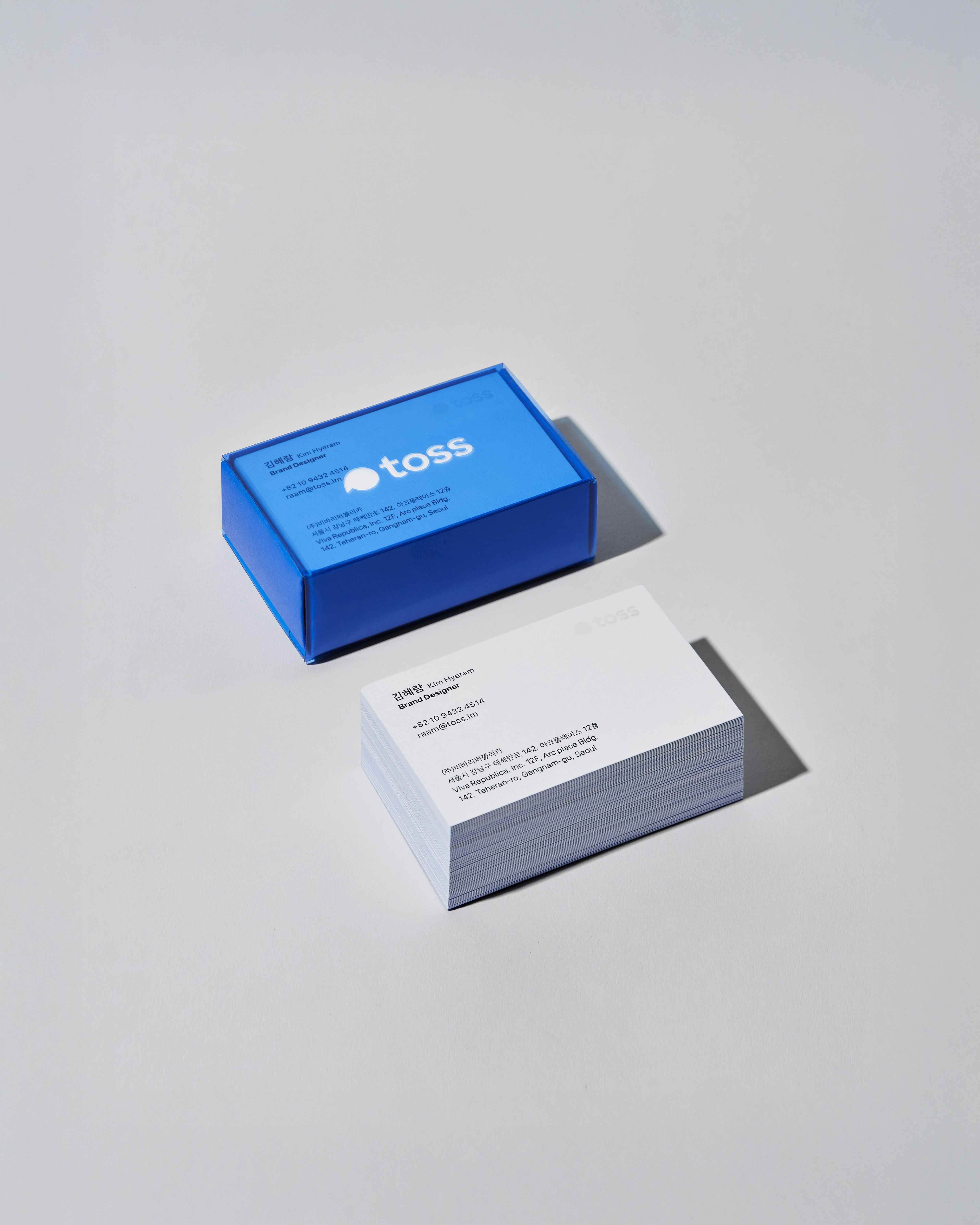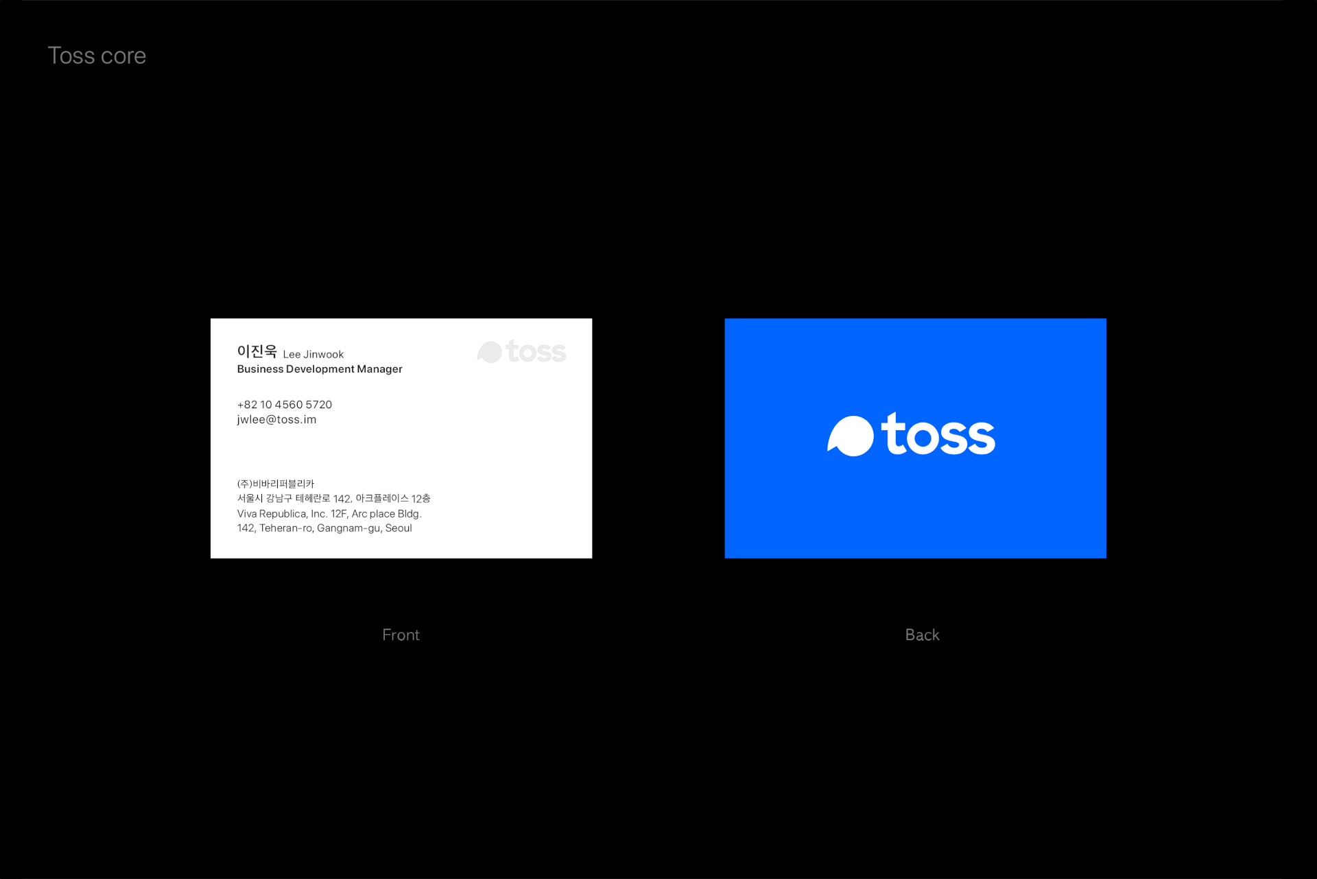In line with the Toss brand identity refinement, the project involved applying a new brand color and restructuring the logos and hierarchy for all subsidiaries. Accordingly, the business card system across all entities was renewed to reinforce brand consistency. For the front of the card, a readability-focused layout and notation system was developed to systematically accommodate the diverse information of a growing organization. On the back, I focused on delivering the brand identity intuitively by making bold use of 'Toss Blue.'