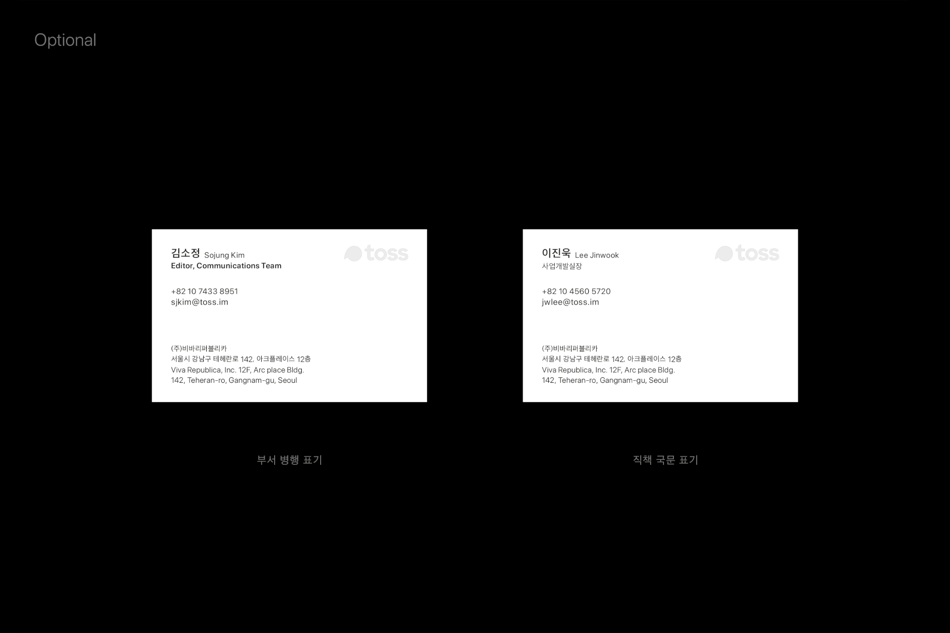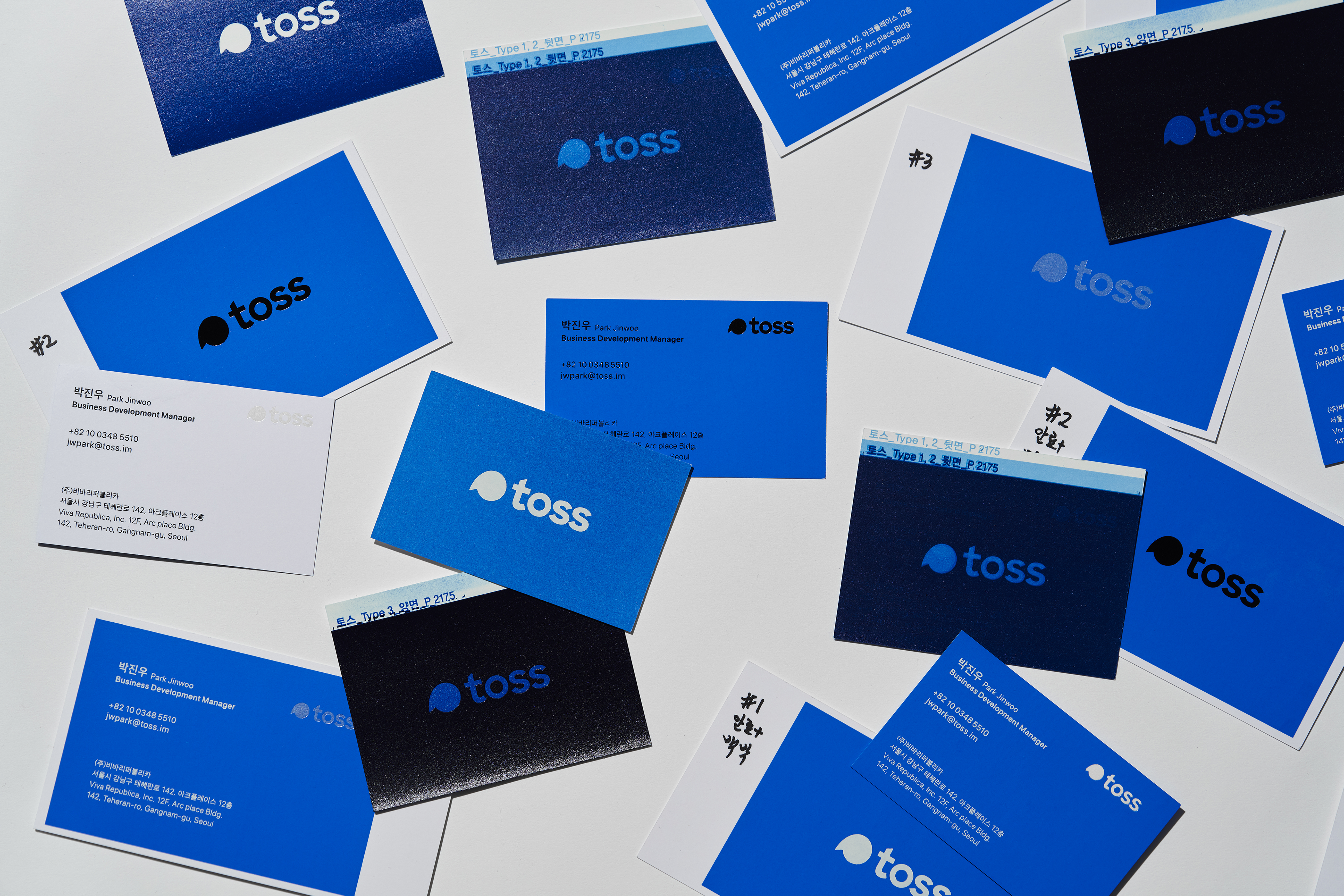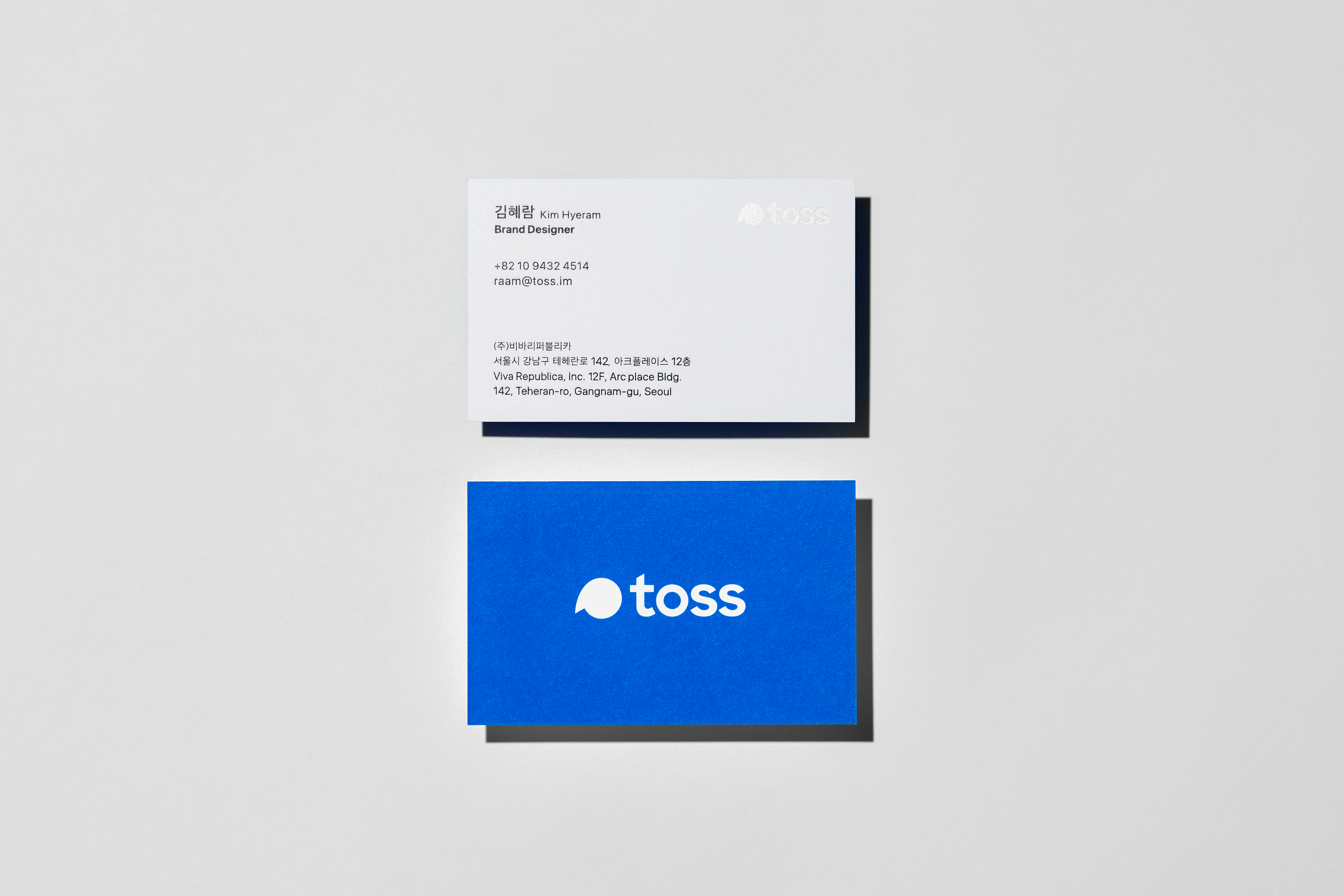 In line with the Toss brand identity refinement, the project involved applying a new brand color and restructuring the logos and hierarchy for all subsidiaries. Accordingly, the business card system across all entities was renewed to reinforce brand consistency. For the front of the card, a readability-focused layout and notation system was developed to systematically accommodate the diverse information of a growing organization. On the back, I focused on delivering the brand identity intuitively by making bold use of 'Toss Blue.'