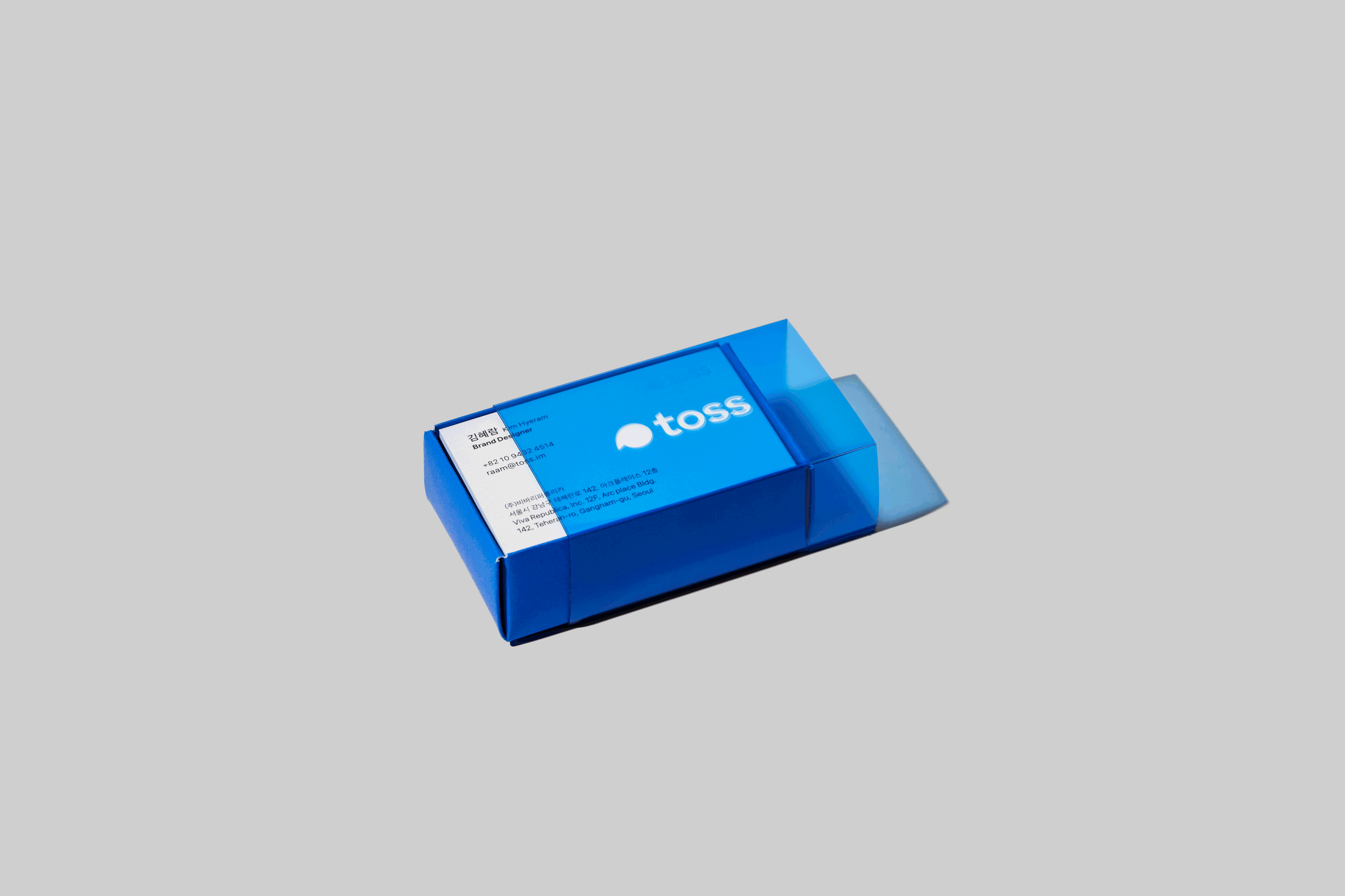 The redesigned business card case was conceived as an extension of the brand experience. The sliding structure reflects the seamless and effortless usability of Toss services, while the translucent material visualizes the core values of trust and transparency. Through extensive material sampling and print testing, optimal tactile quality and color precision were achieved. Finally, by integrating with the internal issuance system, I established a streamlined process that ensures all team members can request business cards under a unified set of brand guidelines.